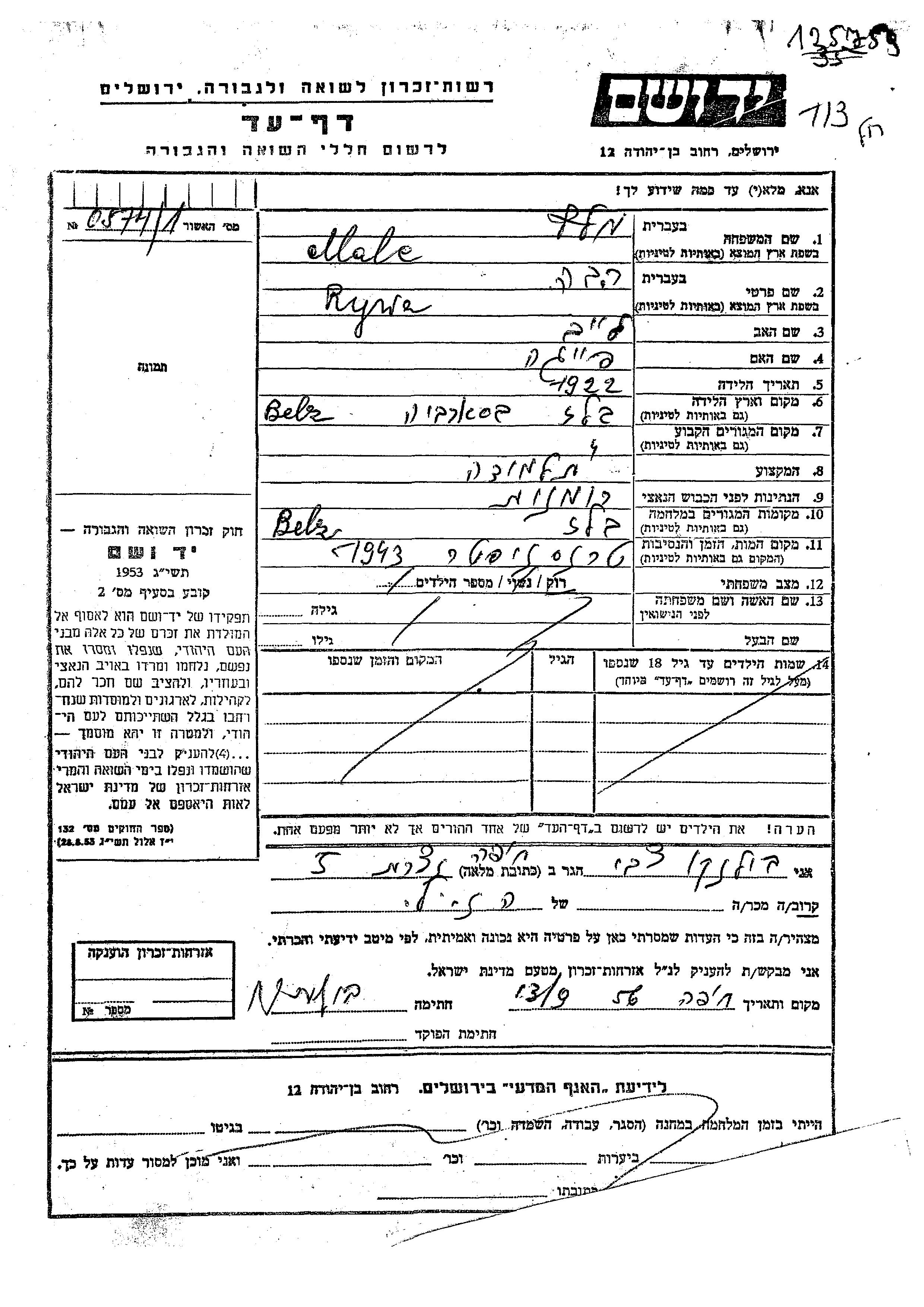 Malc Rywa 1922 Belz, Roumanie Feuille de témoignage