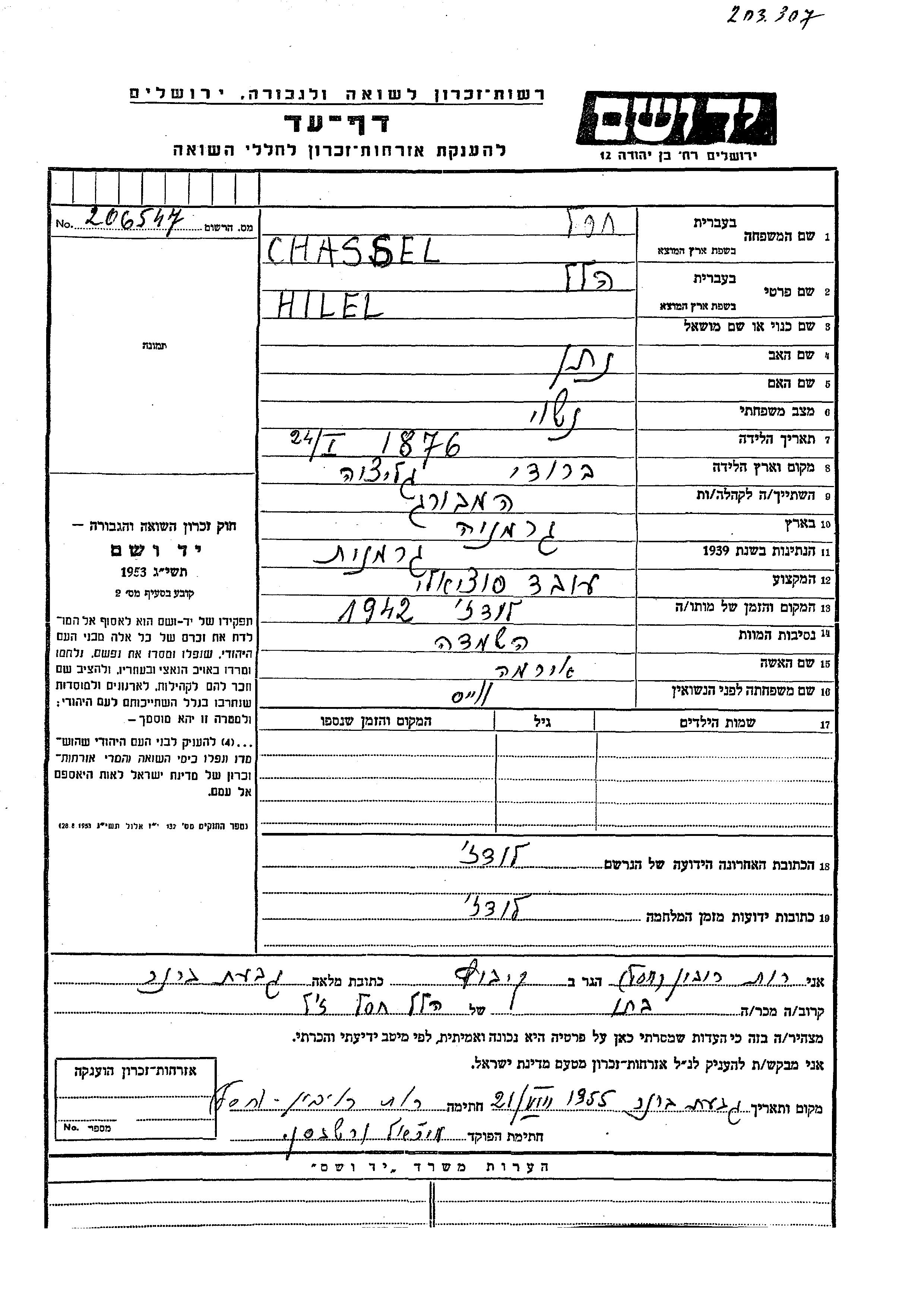 Hilel Chassel est né à Brody, Pologne en 1876, fils de Natan. Il était Travailleur social. Avant la seconde guerre mondiale il vivait à Hamburg, Allemagne. Au cours de la guerre, il était à Lodz, Pologne.