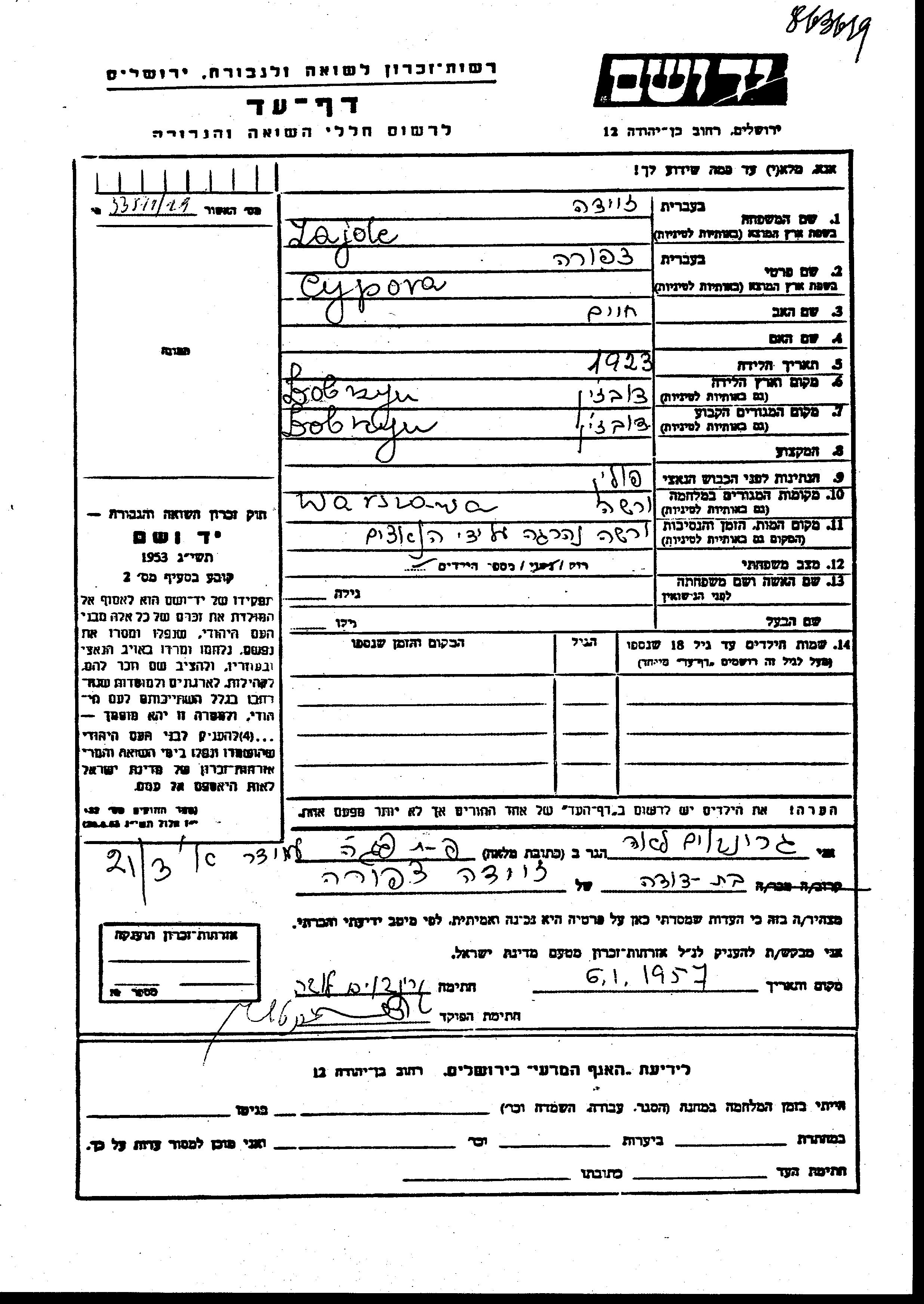 Cypora Zajde est née à Dobrzyn, Pologne en 1923, fille de Khaim. Elle était Célibataire. Avant la seconde guerre mondiale elle vivait à Dobrzyn, Pologne. Pendant la guerre, elle était à Warsaw, Pologne.