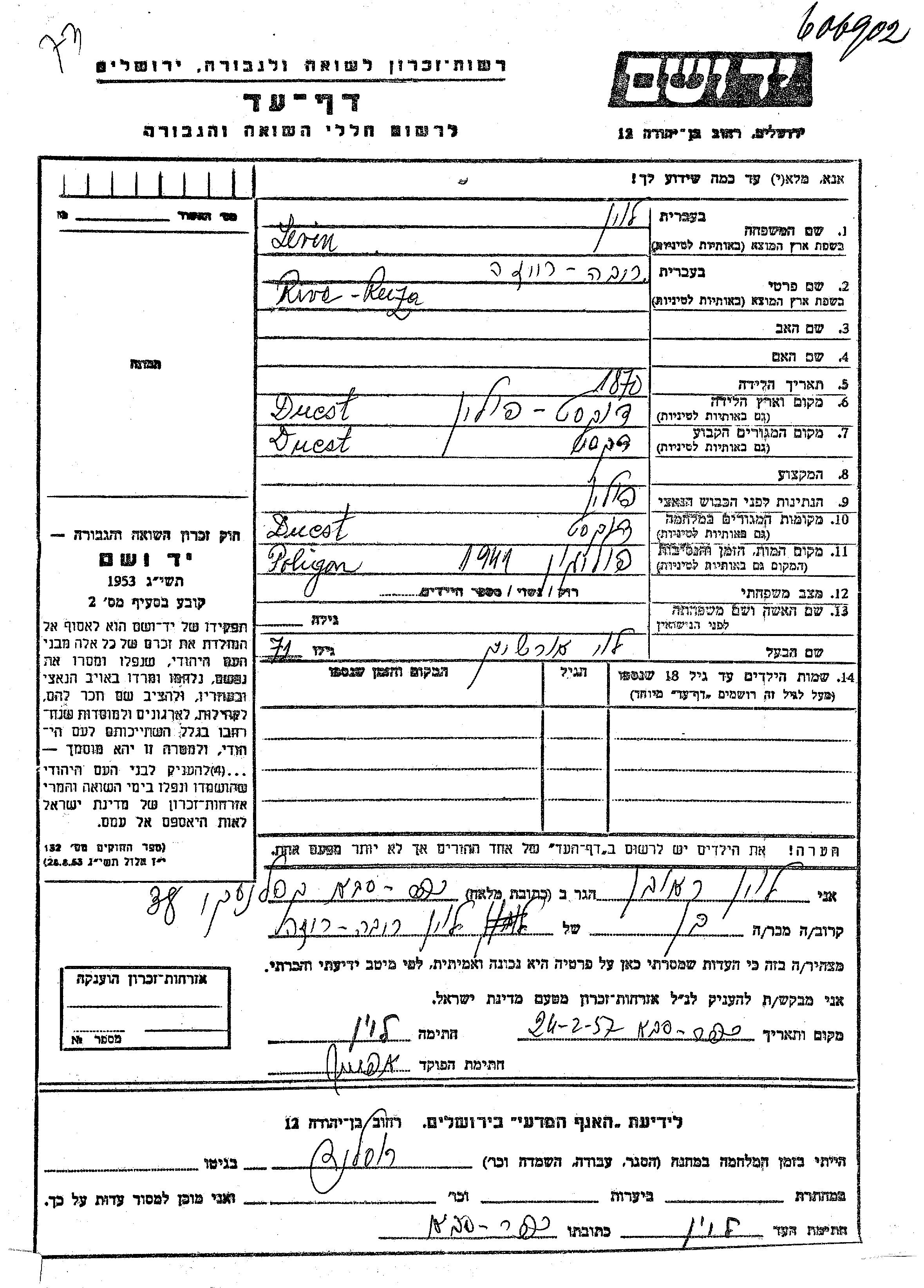 Riva Reiza Levin née Orshain est née à Dukst, Pologne en 1870. Elle était Mariée à Levi. Avant la seconde guerre mondiale elle vivait à Dukst, Pologne. Pendant la guerre, elle était à Dukst, Pologne.