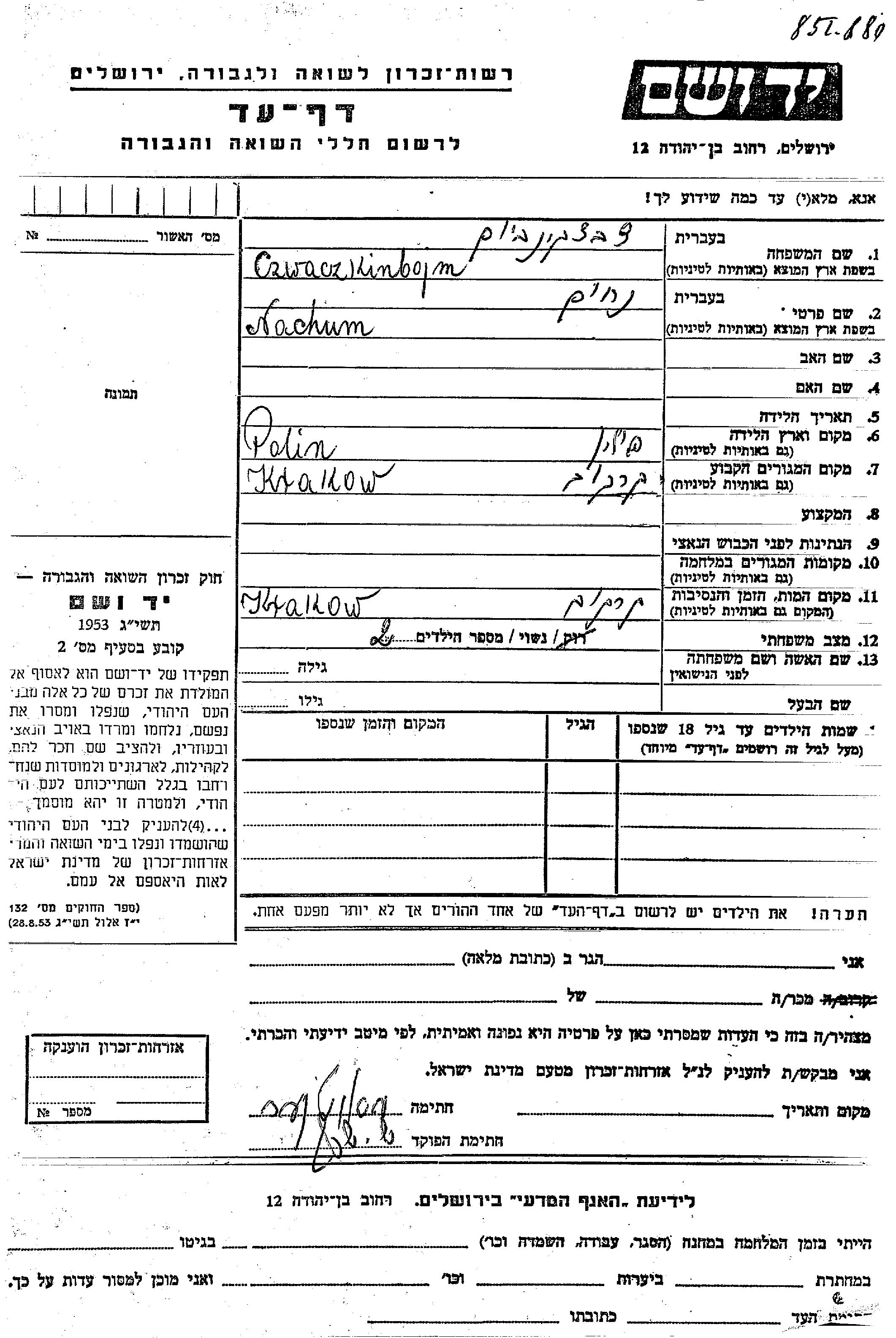 Czwaczkinbojm Nachum Krakow, Pologne Feuille de témoignage
