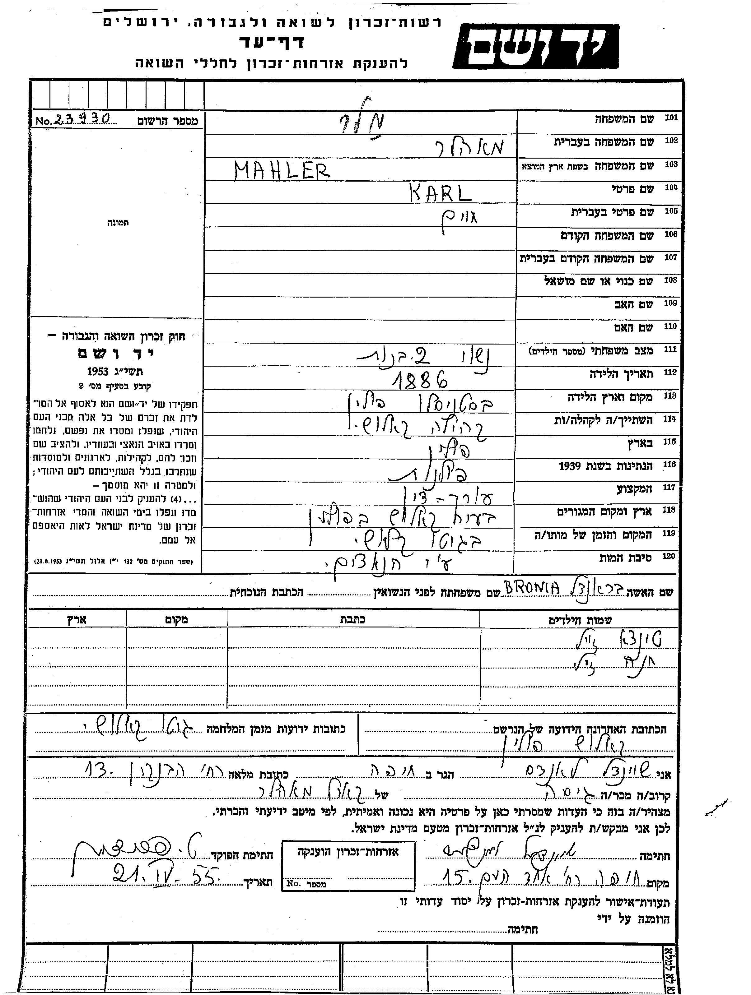 Mahler Karl Khaim 1886 Kalush, Pologne Feuille de témoignage