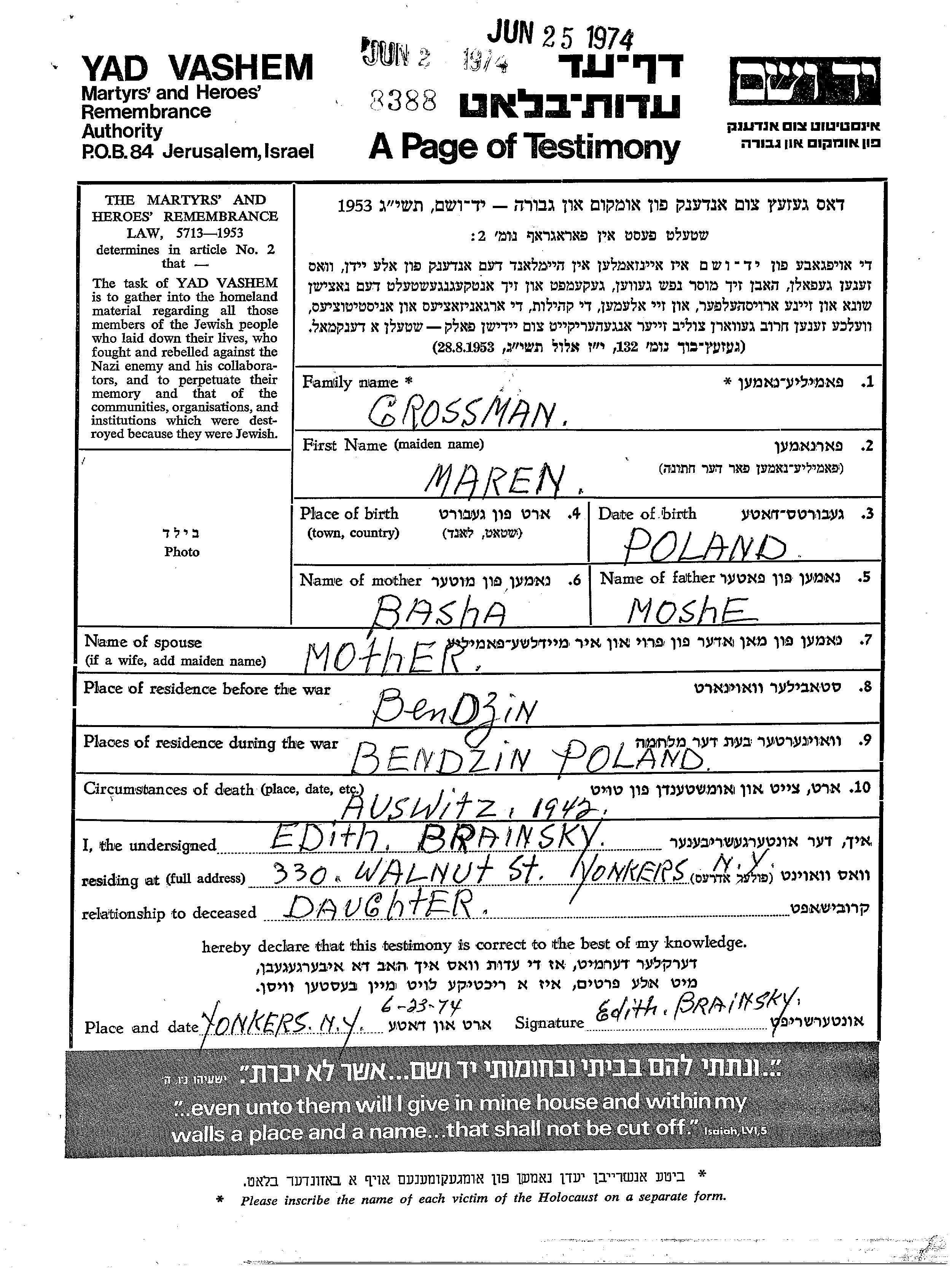 Grossman Maren Bendzin, Pologne Feuille de témoignage