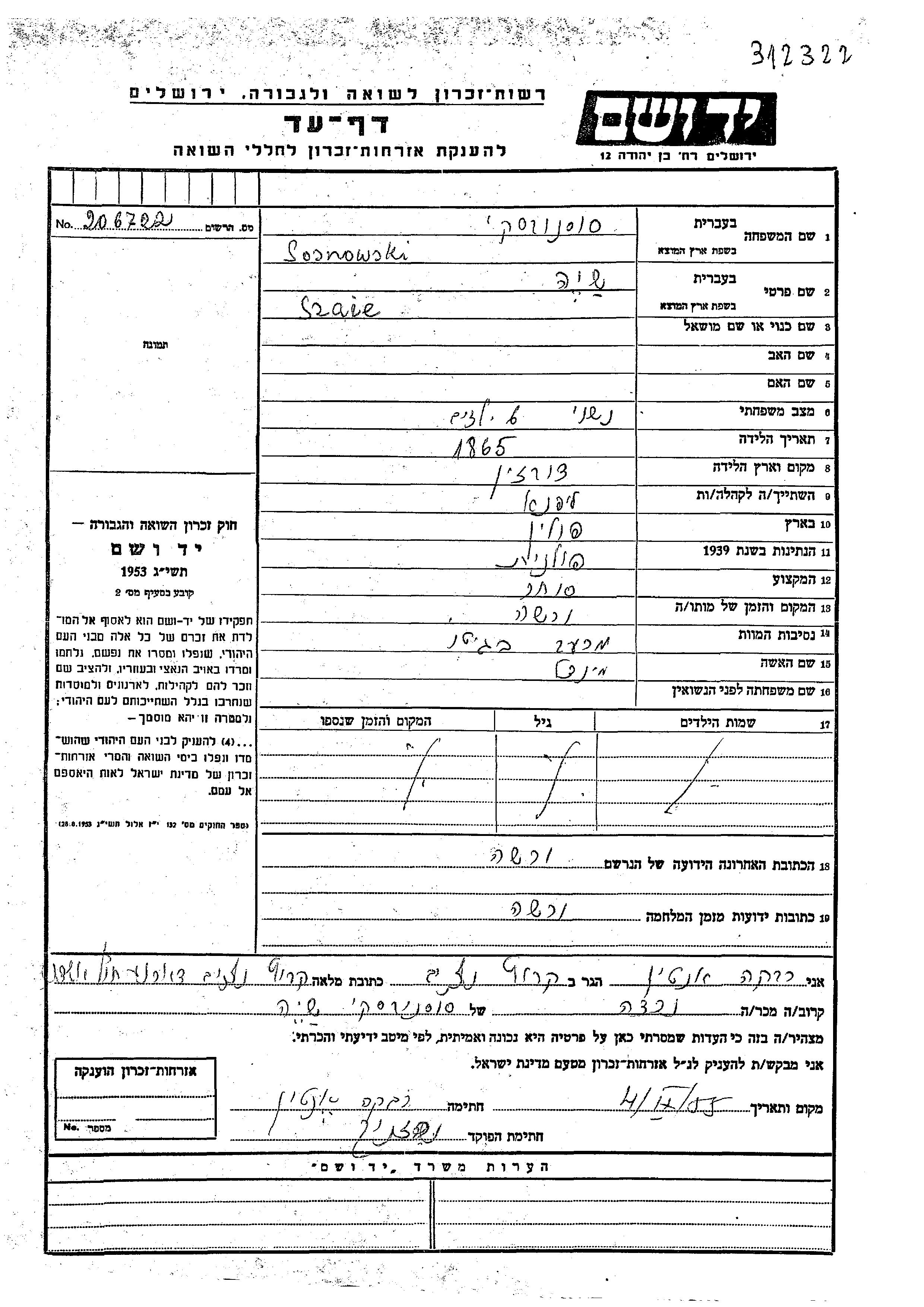 Szaie Sosnowski est né à Dobrzyn, Pologne en 1865. Il était Commerçant/e. Avant la seconde guerre mondiale il vivait à Lipno, Pologne. Au cours de la guerre, il était à Warszawa, Pologne.