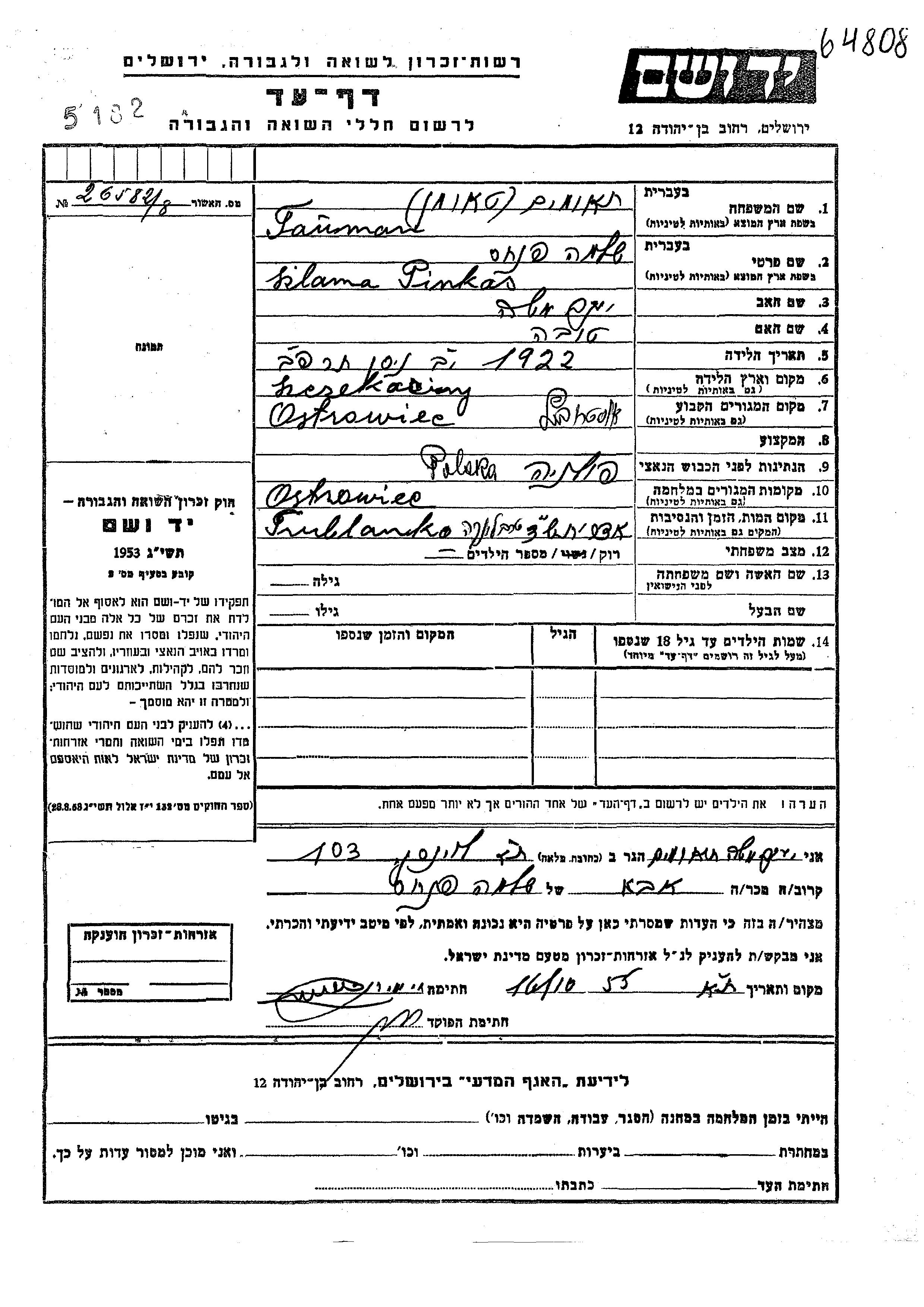 Teomim Tauman Szlama Pinkhas 1922 Ostrowiec, Pologne Feuille de témoignage