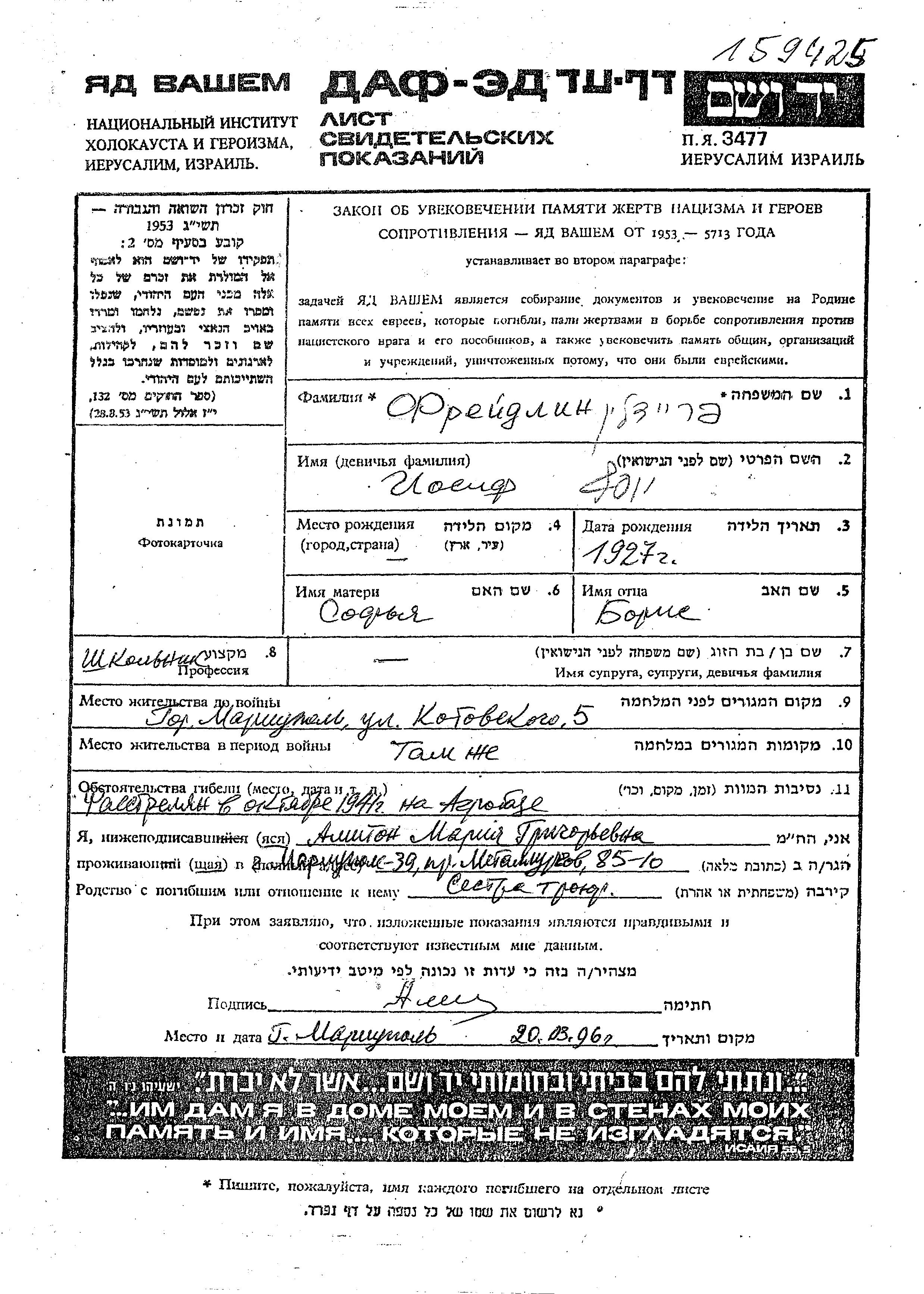 Freidlin Iosif 1927 Mariupol, Ukraine (URSS) Feuille de témoignage