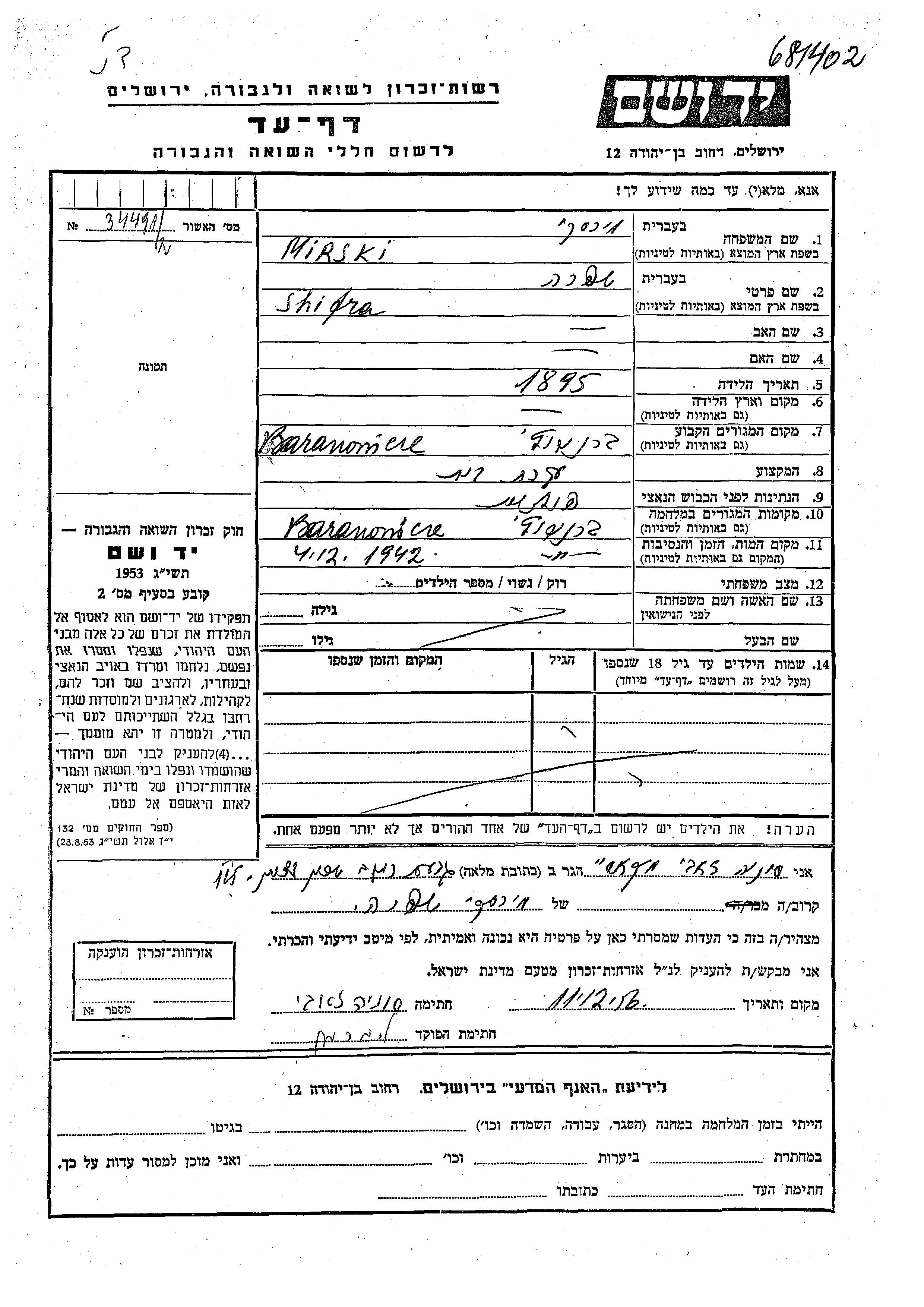 Mirski Shifra 1895 Baranowicze, Pologne Feuille de témoignage