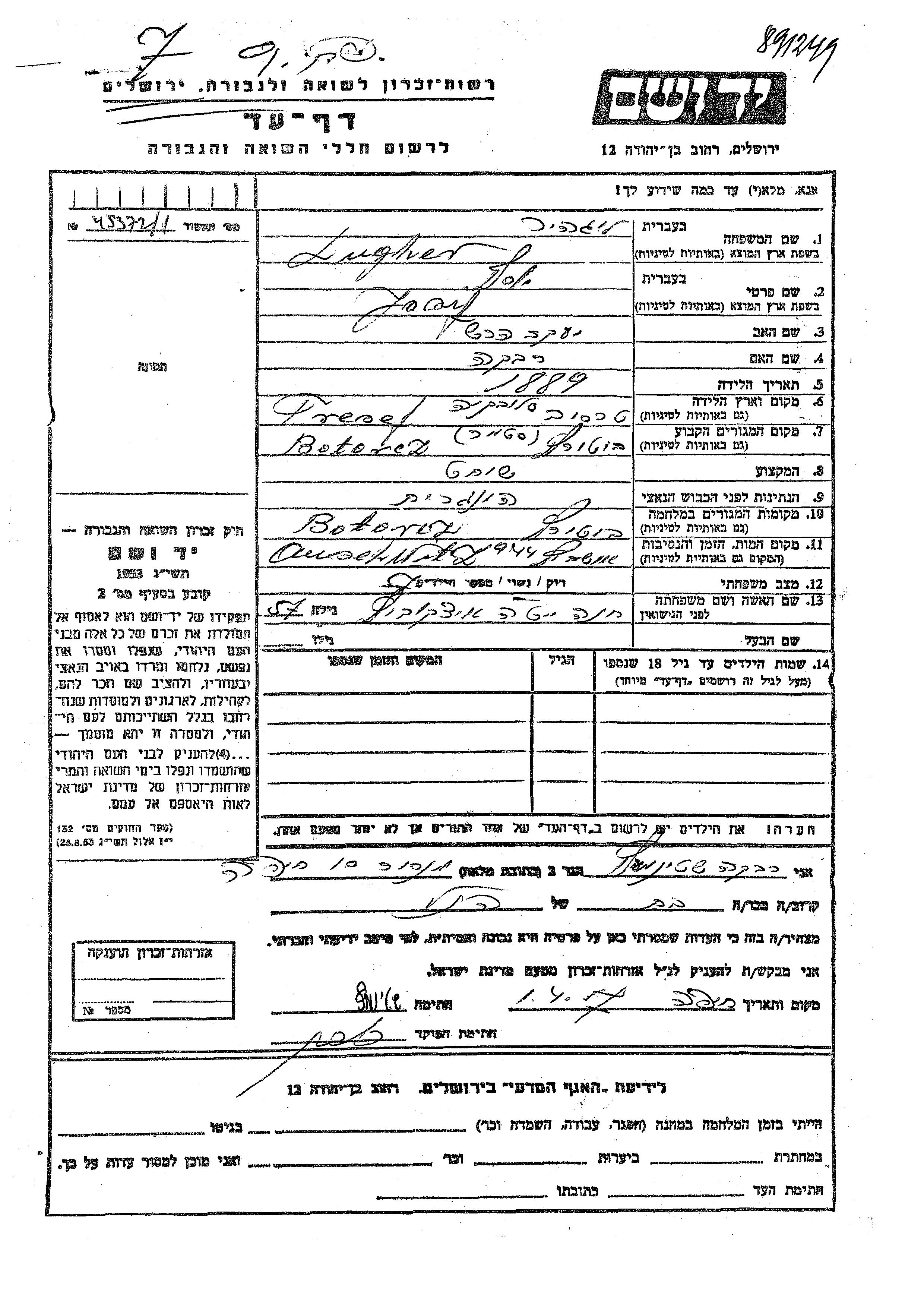 Yosef Lugher est né à Tresef, Tchécoslovaquie en 1889, fils de Yaakov Hersh et de Rivka. Il était Abatteur rituel et Mariée à Khana Ita née Itzkovitz. Avant la seconde guerre mondiale il vivait à Botoriz, Roumanie. Au cours de la guerre, il était à Botoriz, Roumanie.