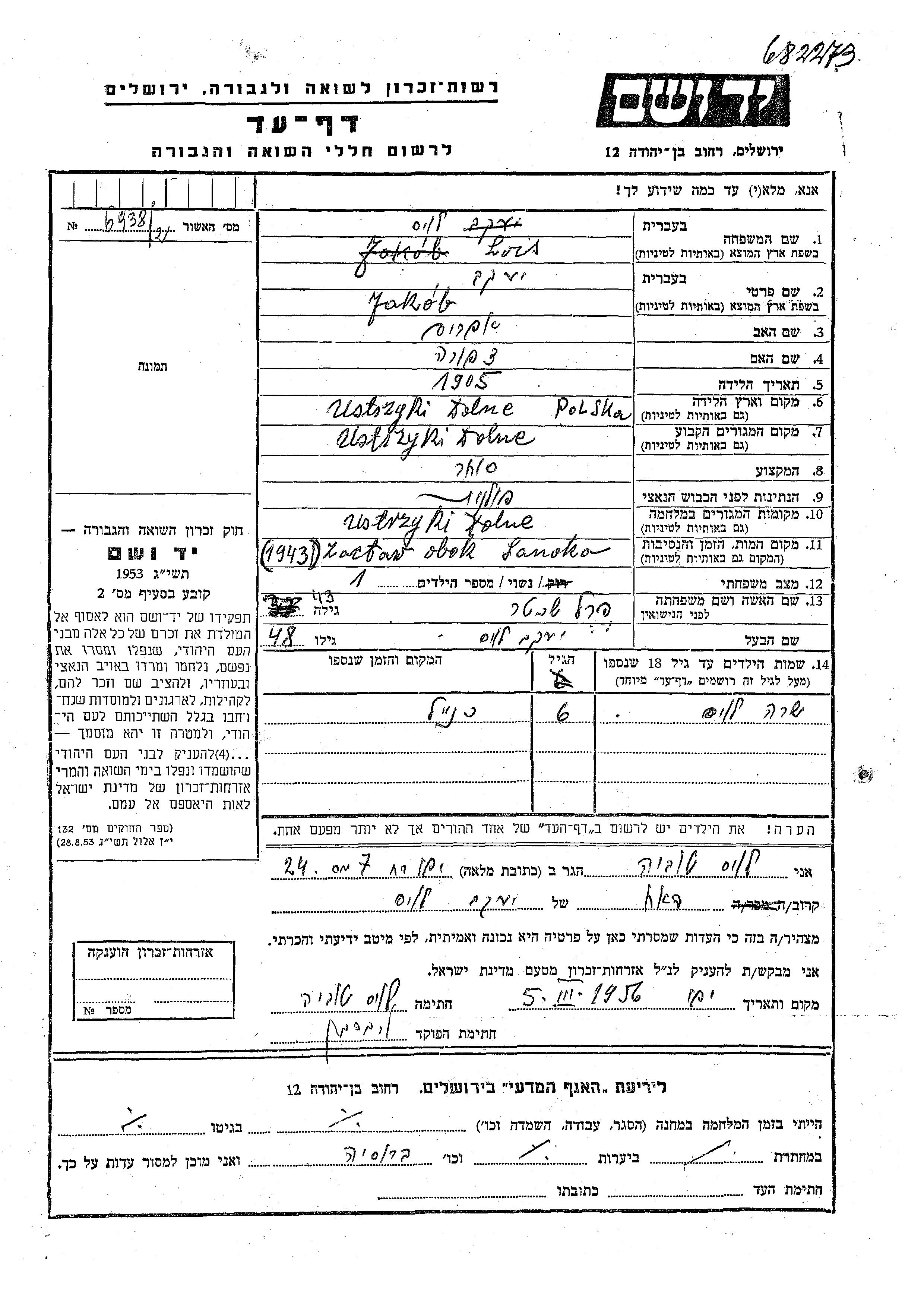 Lois Jakob 1905 Ustrzyki Dolne, Pologne Feuille de témoignage