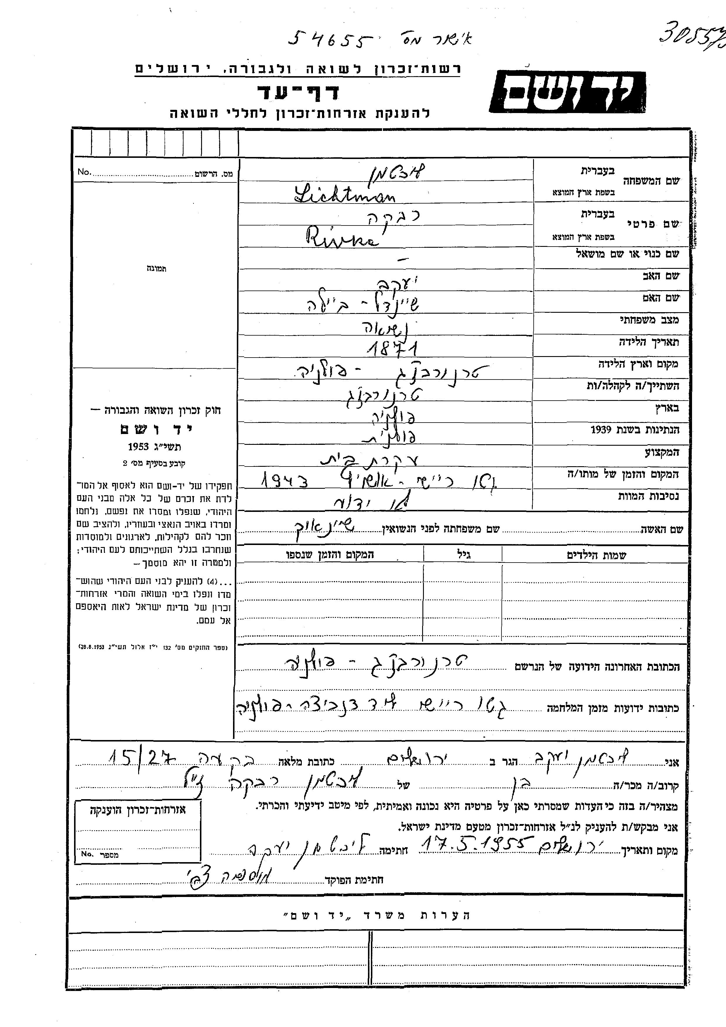 Lichtman Rivka 1871 Tarnobrzeg, Pologne Feuille de témoignage