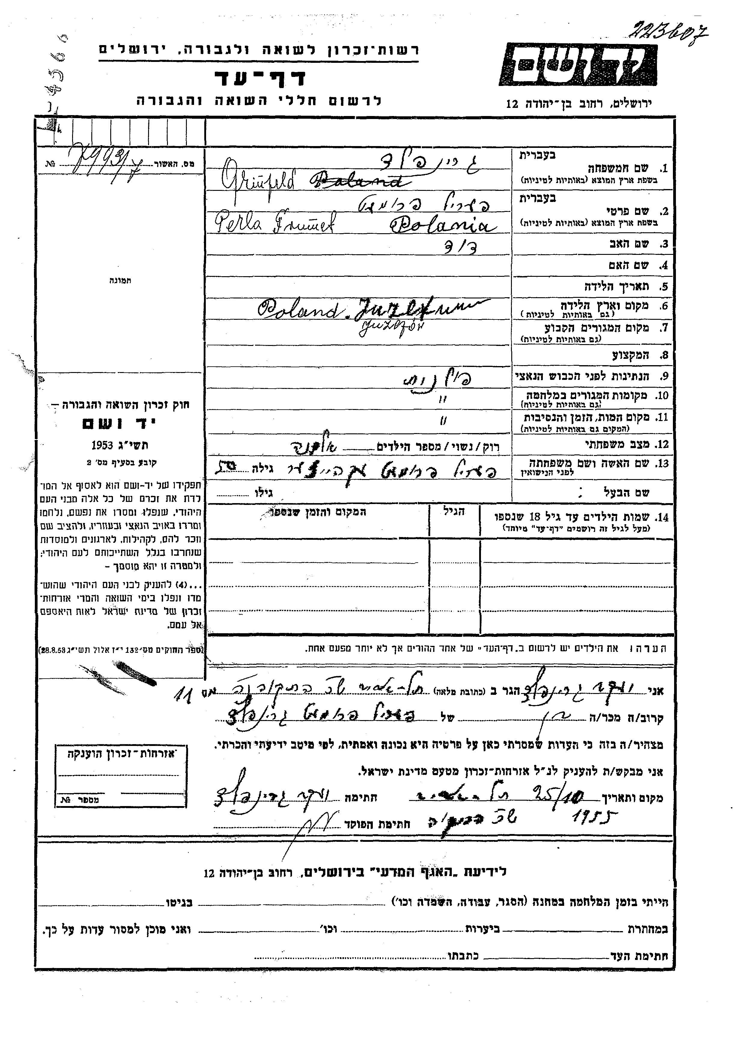 Grünfeld Perla Frumet Jozefow, Pologne Feuille de témoignage