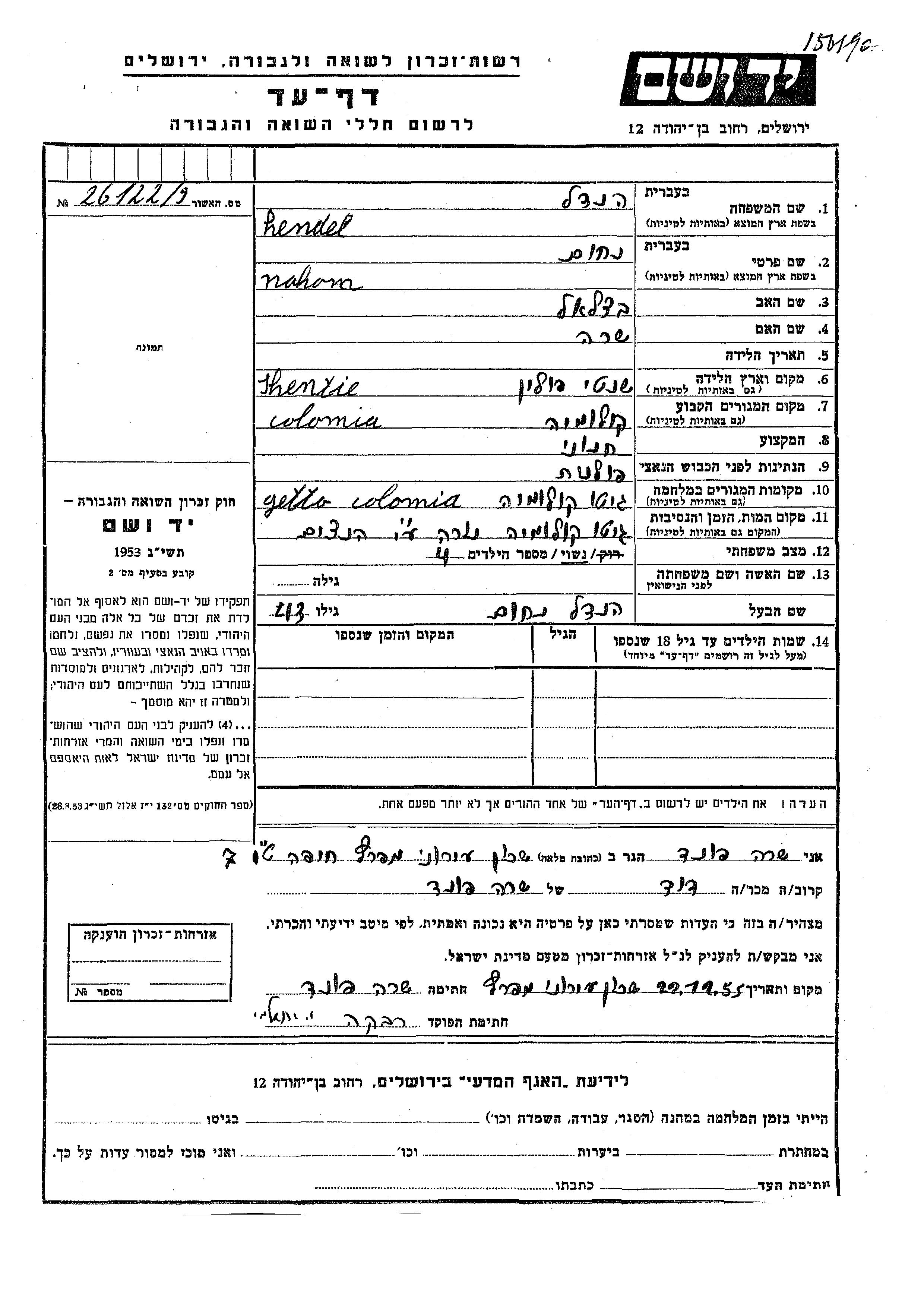 Hendel Nahom Kolomyja, Pologne Feuille de témoignage