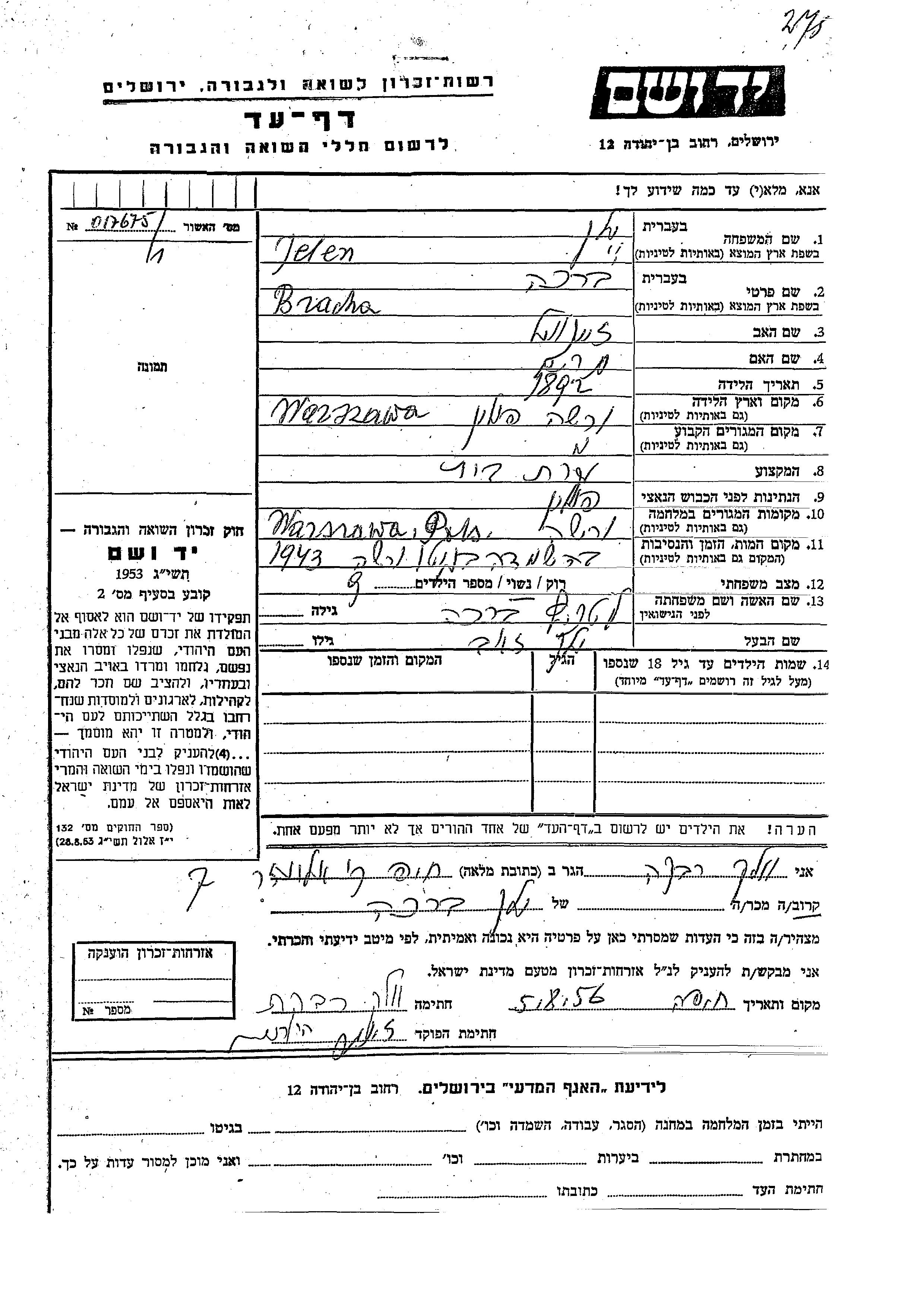 Bracha Jelen née Latkes est née à Warsaw, Pologne en 1892, fille de Zajnvil et de Miriam. Elle était Femme au foyer et Mariée à Zeev. Avant la seconde guerre mondiale elle vivait à Warsaw, Pologne. Pendant la guerre, elle était à Warsaw, Pologne.