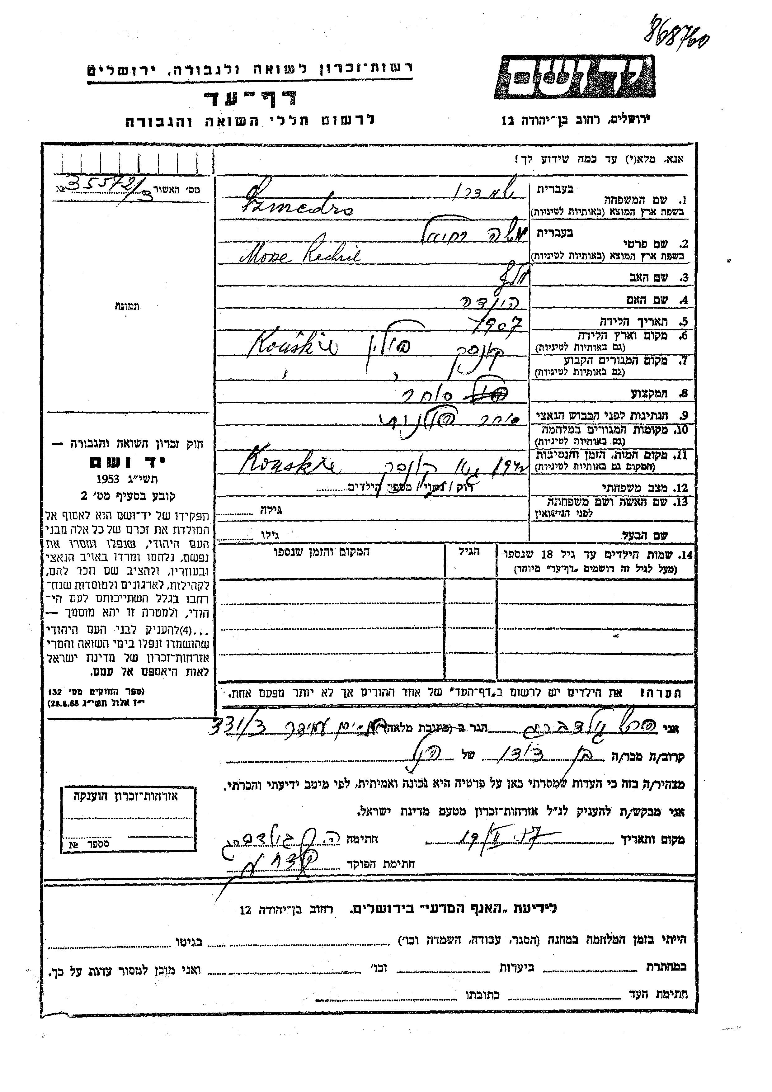 Szmedro Mosze Rechiel 1907 Końskie, Pologne Feuille de témoignage