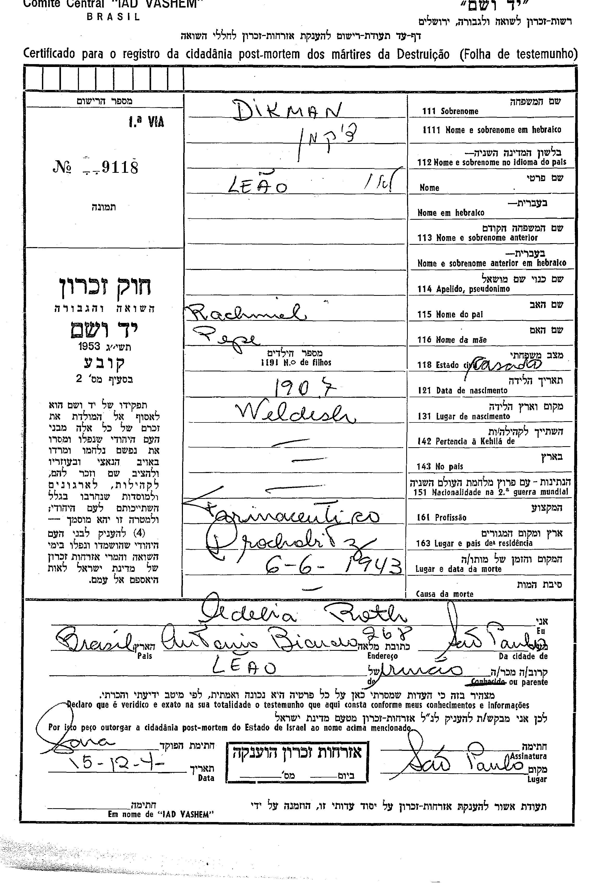 Dikman Leao 1907 Drochobicz, Pologne Feuille de témoignage