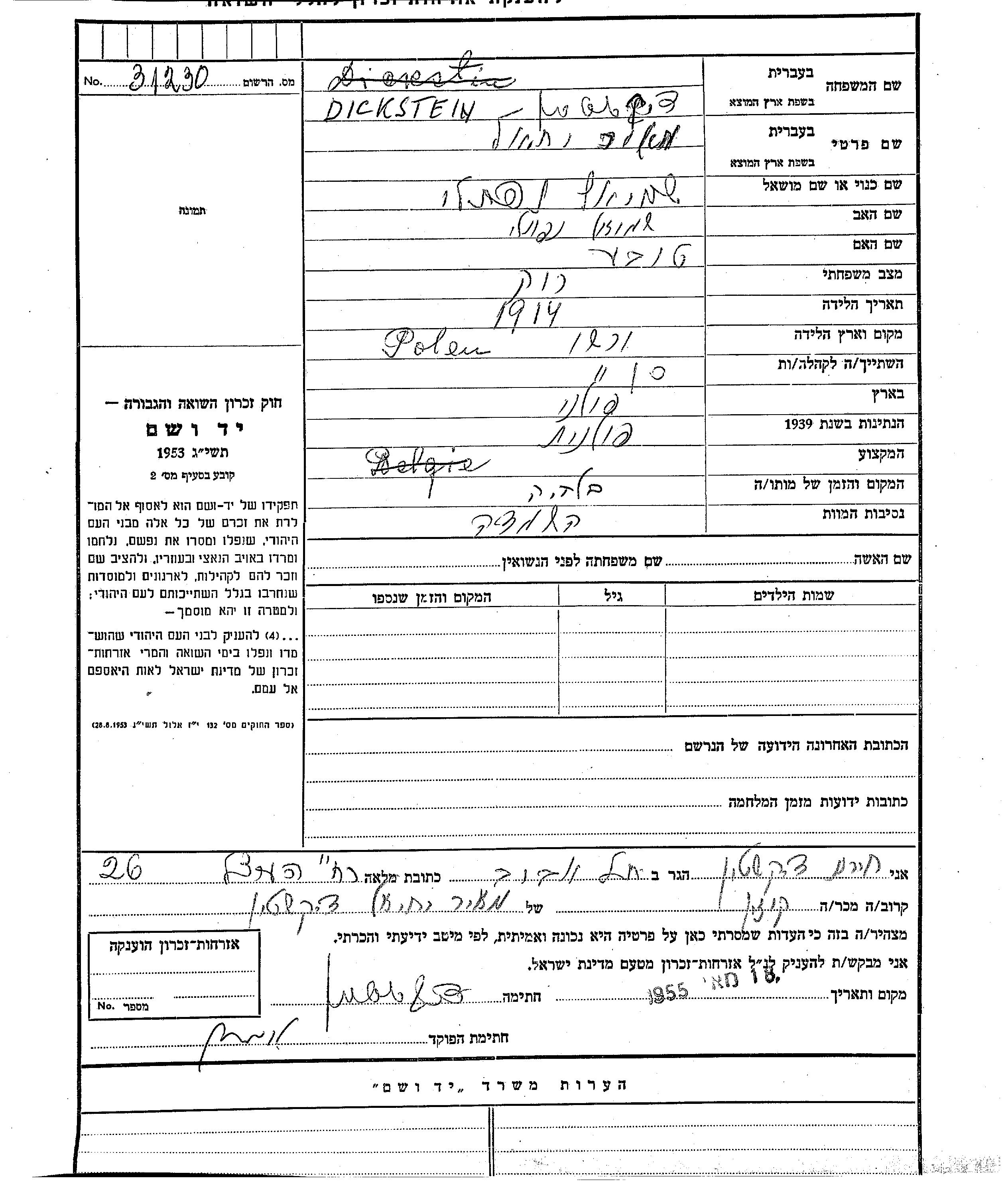 Dickstein Meir Yekhiel 1914 Warsaw, Pologne Feuille de témoignage