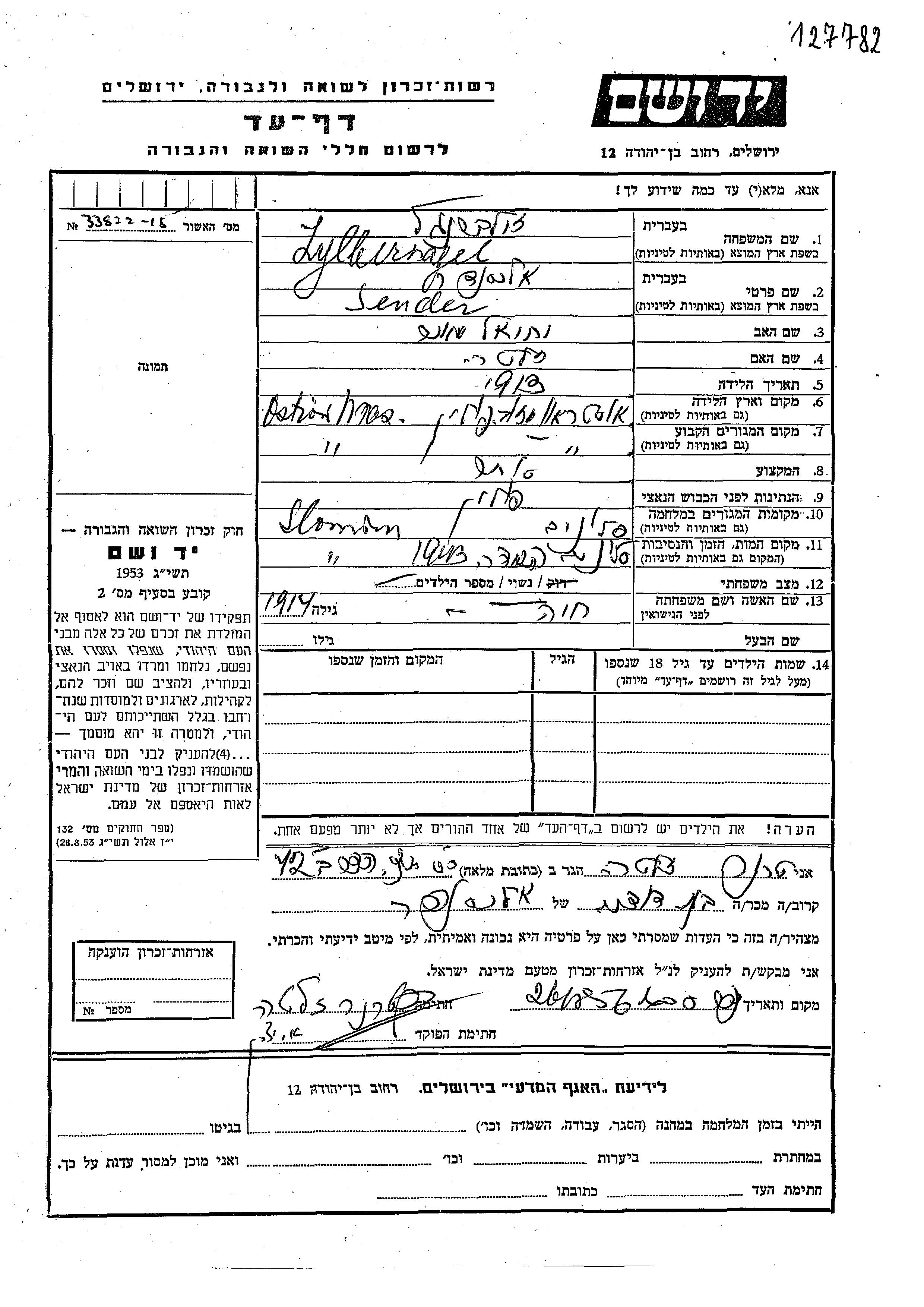 Sender a été assassiné pendant la Shoah. Lieu de la mort: Slonim, Pologne en 1943.
