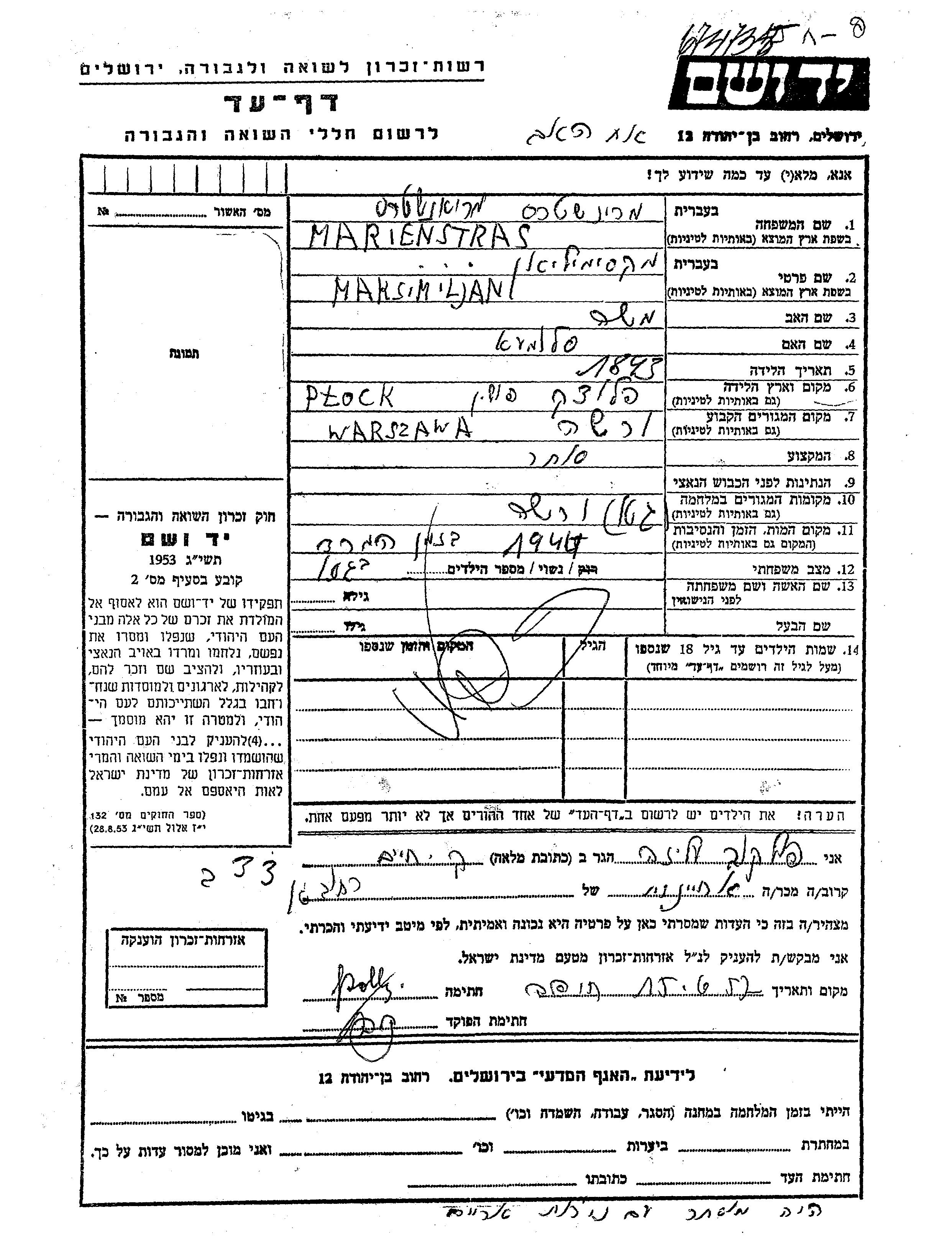 Marienstras Maksimiljan 1893 Warszawa, Pologne Feuille de témoignage