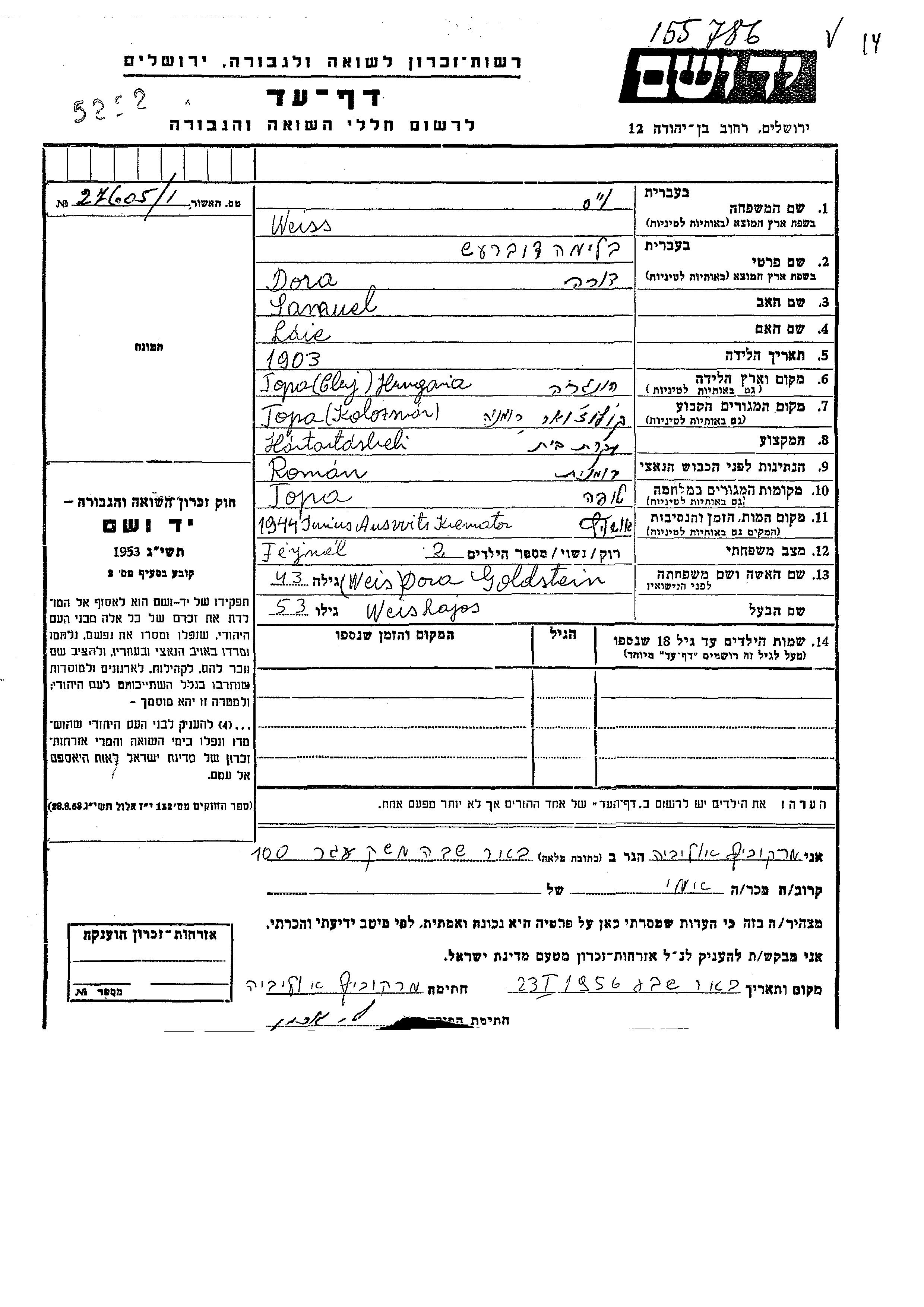 Weiss Dora Blima Dobra 1903 Topa, Roumanie Feuille de témoignage