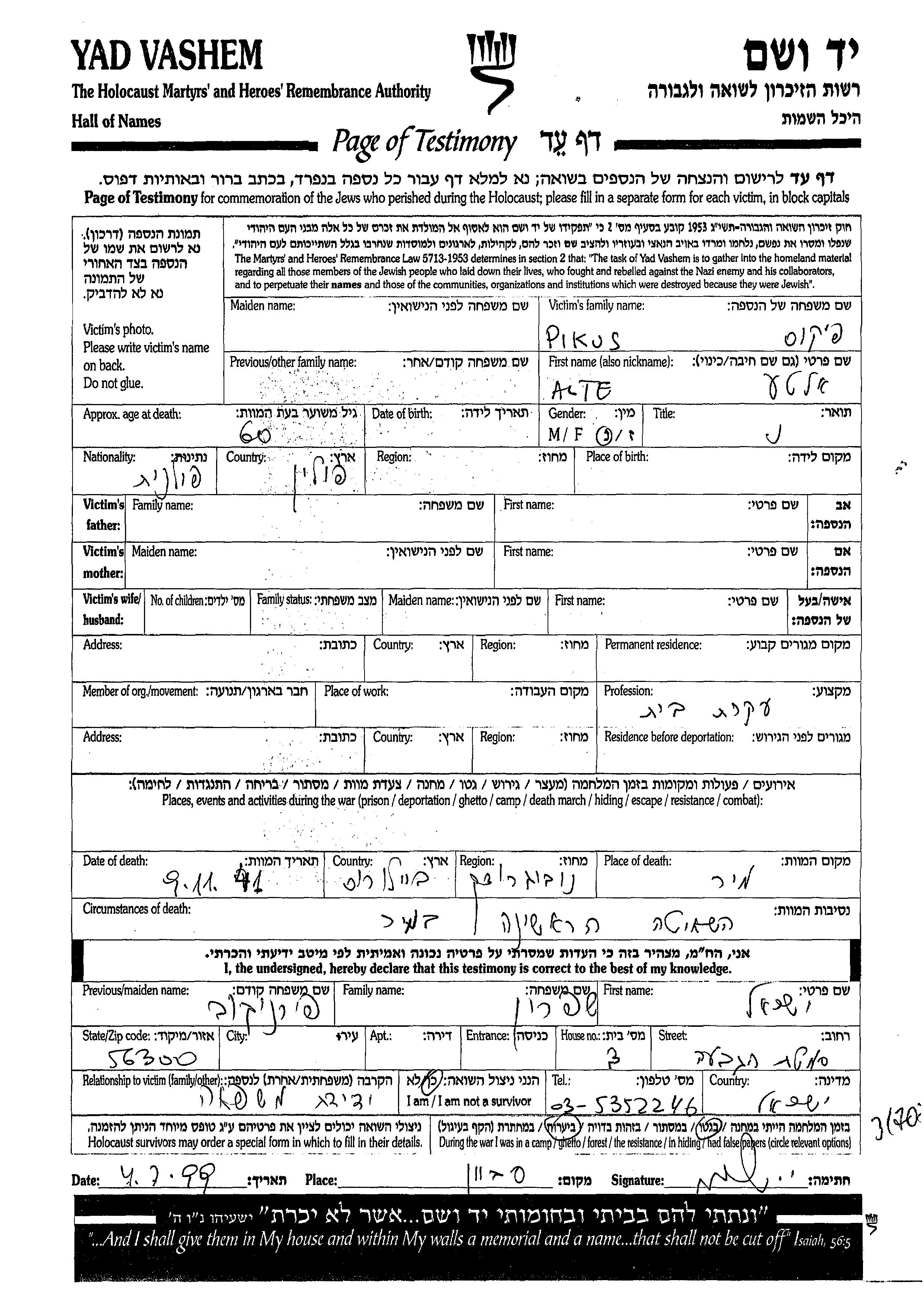 Yad Vashem - Pages of Testimony Names Memorial Collection