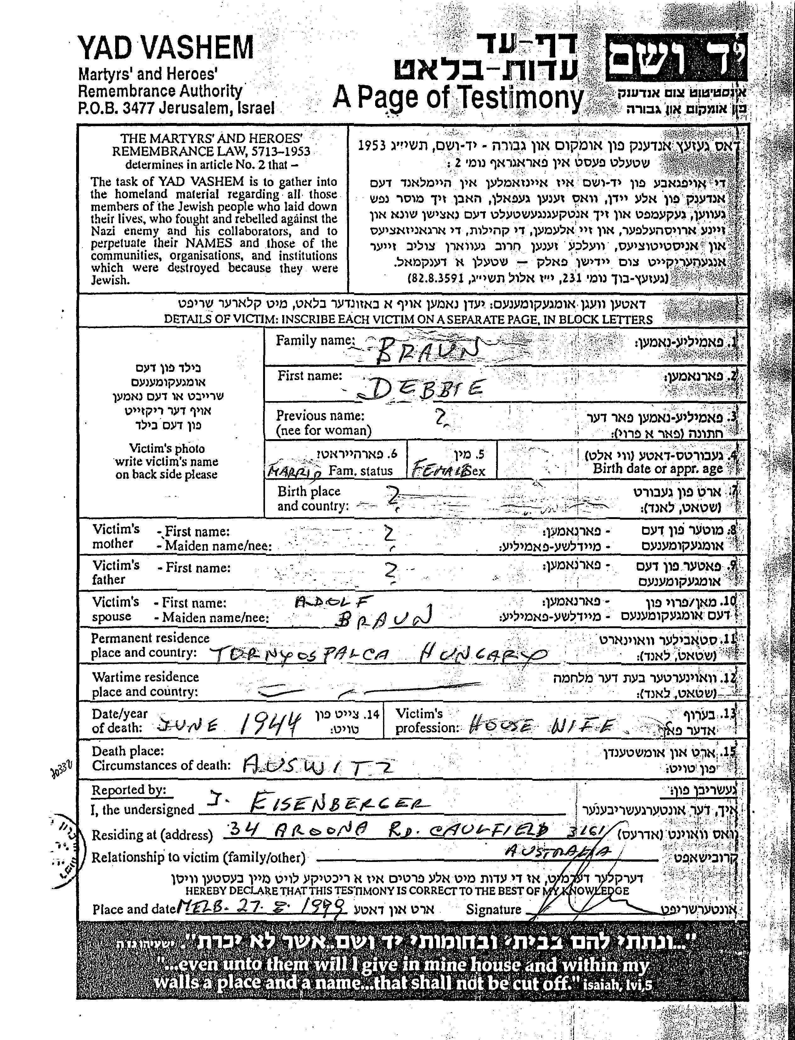 Debbie Braun. Elle était Femme au foyer et Mariée à Adolf. Avant la seconde guerre mondiale elle vivait à Tornyospalca, Hongrie. Pendant la guerre, elle était à Tornyospalca, Hongrie.