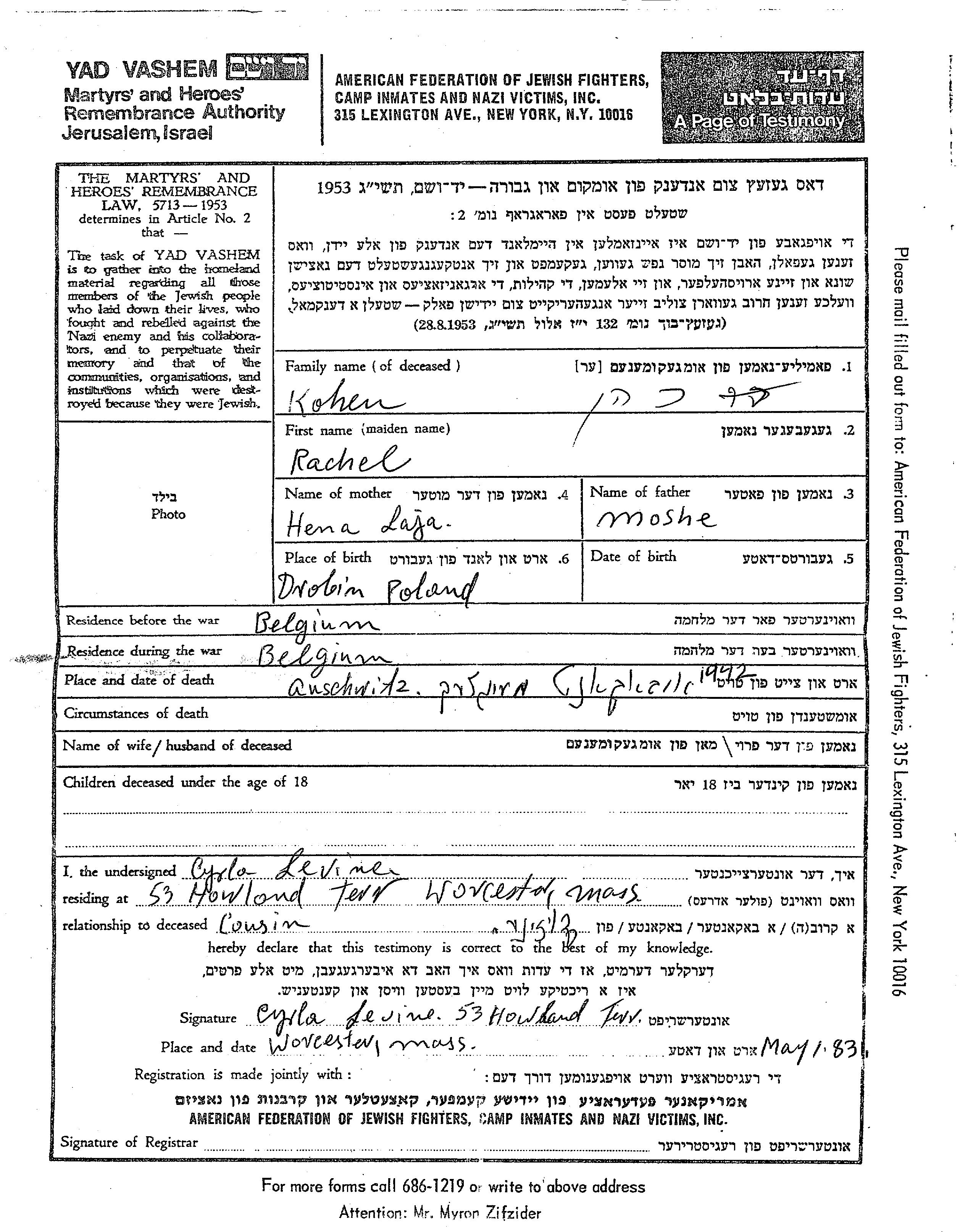 Rachel a été assassinée pendant la Shoah. Lieu de la mort: Auschwitz, Pologne en 1942.