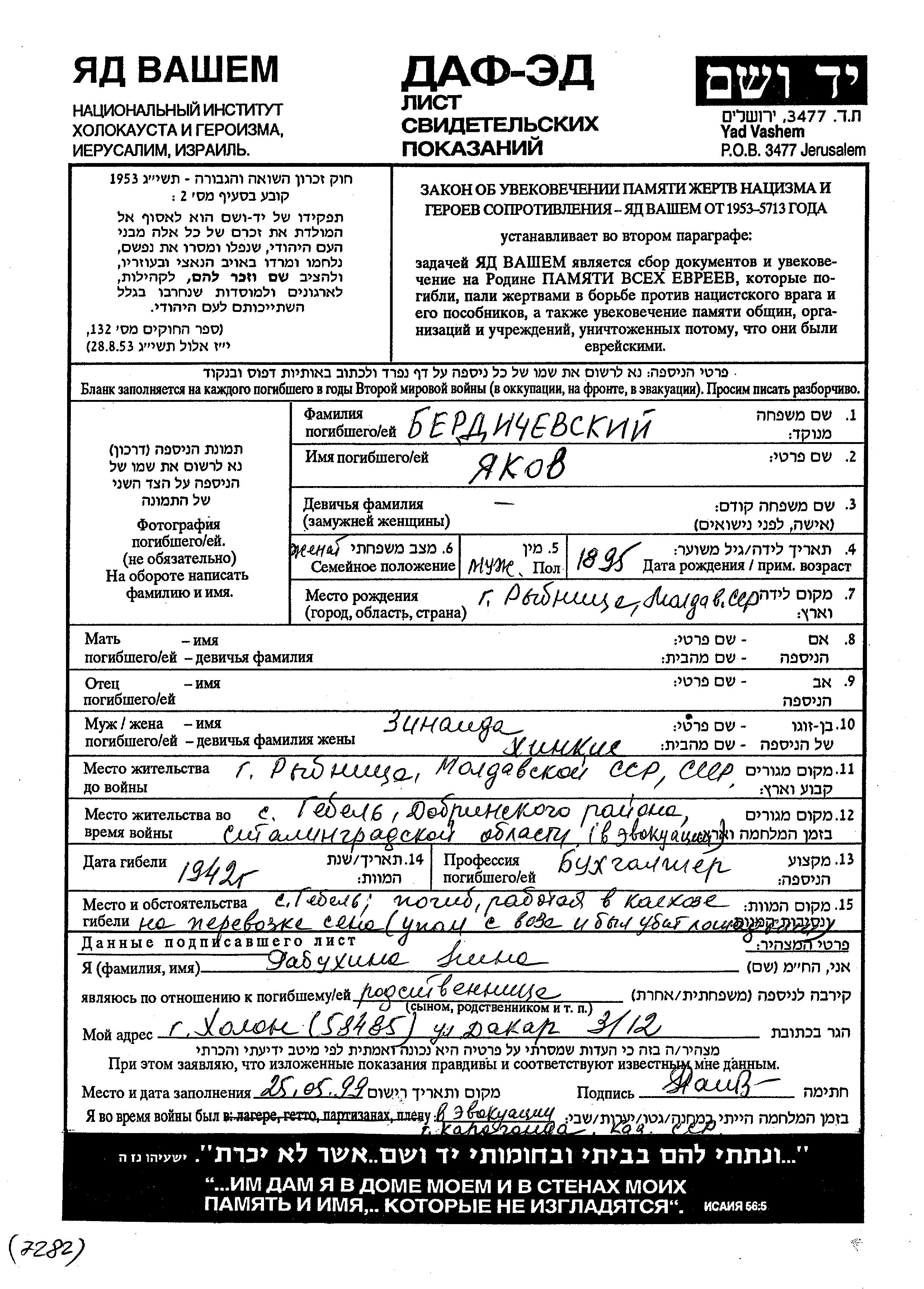 Berdichevski Yakov endroit inconnu, Feuille de témoignage