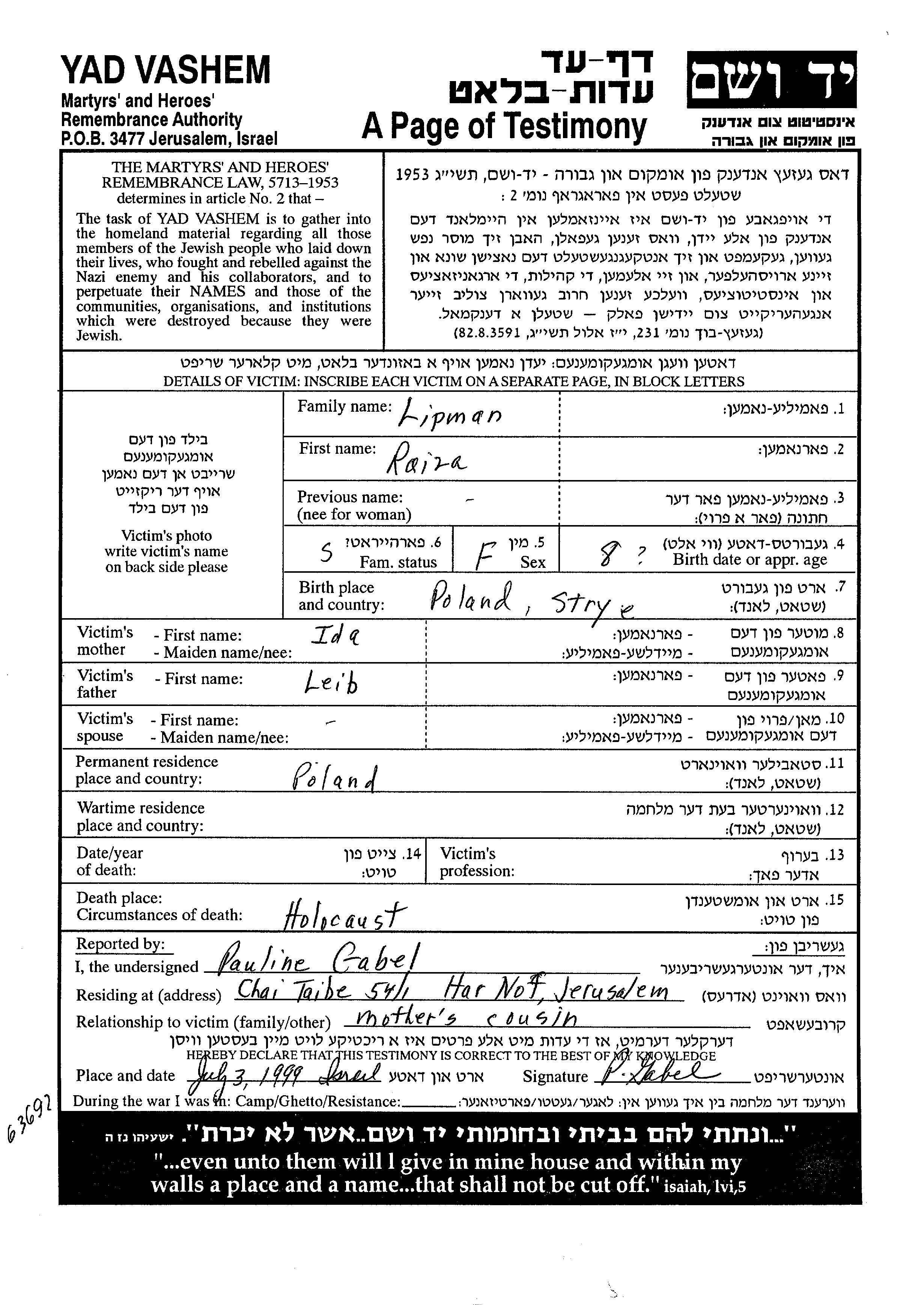 Raiza Lipman est née à Stry, Pologne, fille de Leib et de Ida. Elle était Enfant. Avant la seconde guerre mondiale elle vivait à Pologne.