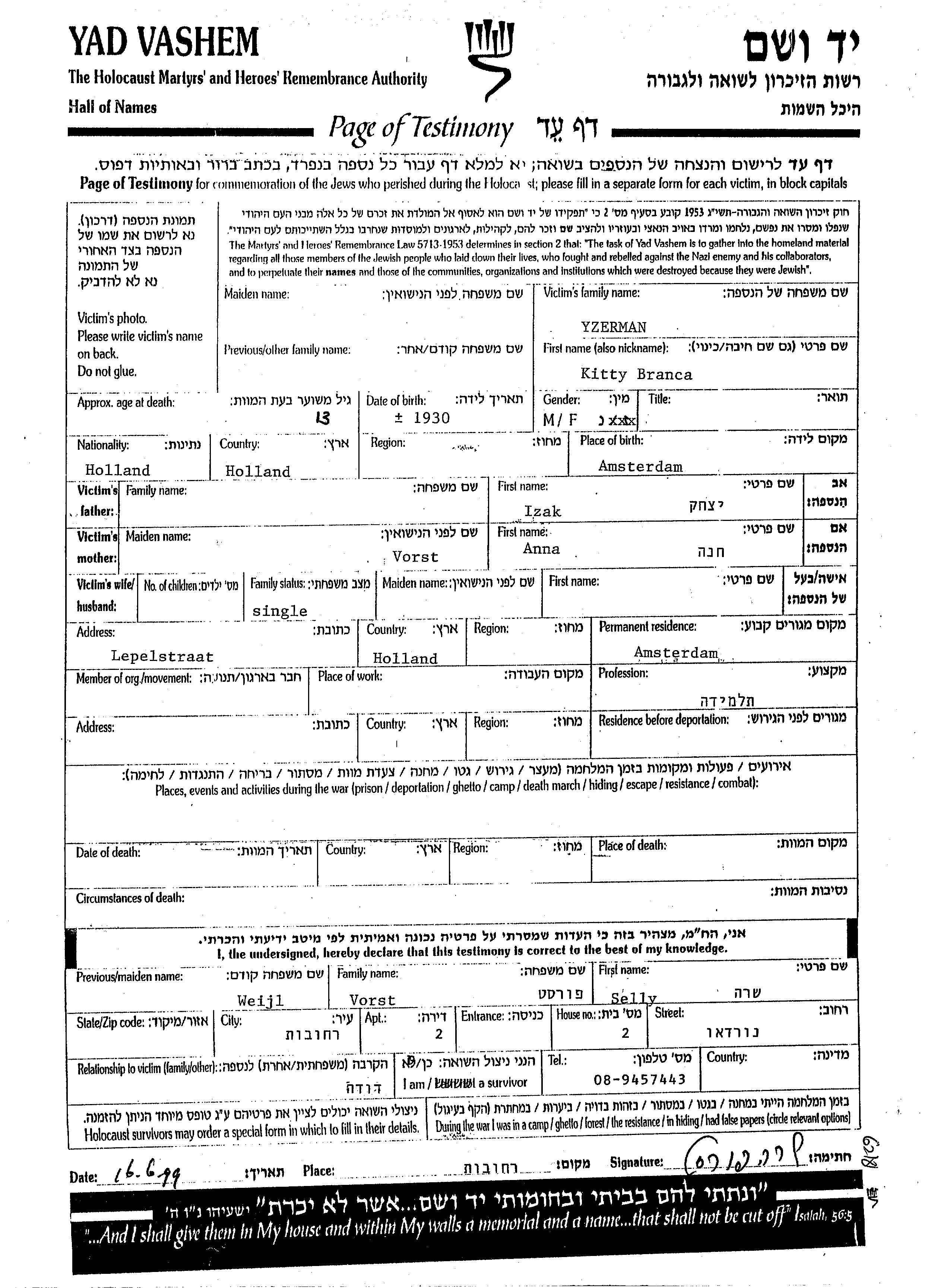 Yzerman Kitty Branca 1930 Amsterdam, Pays-Bas Feuille de témoignage
