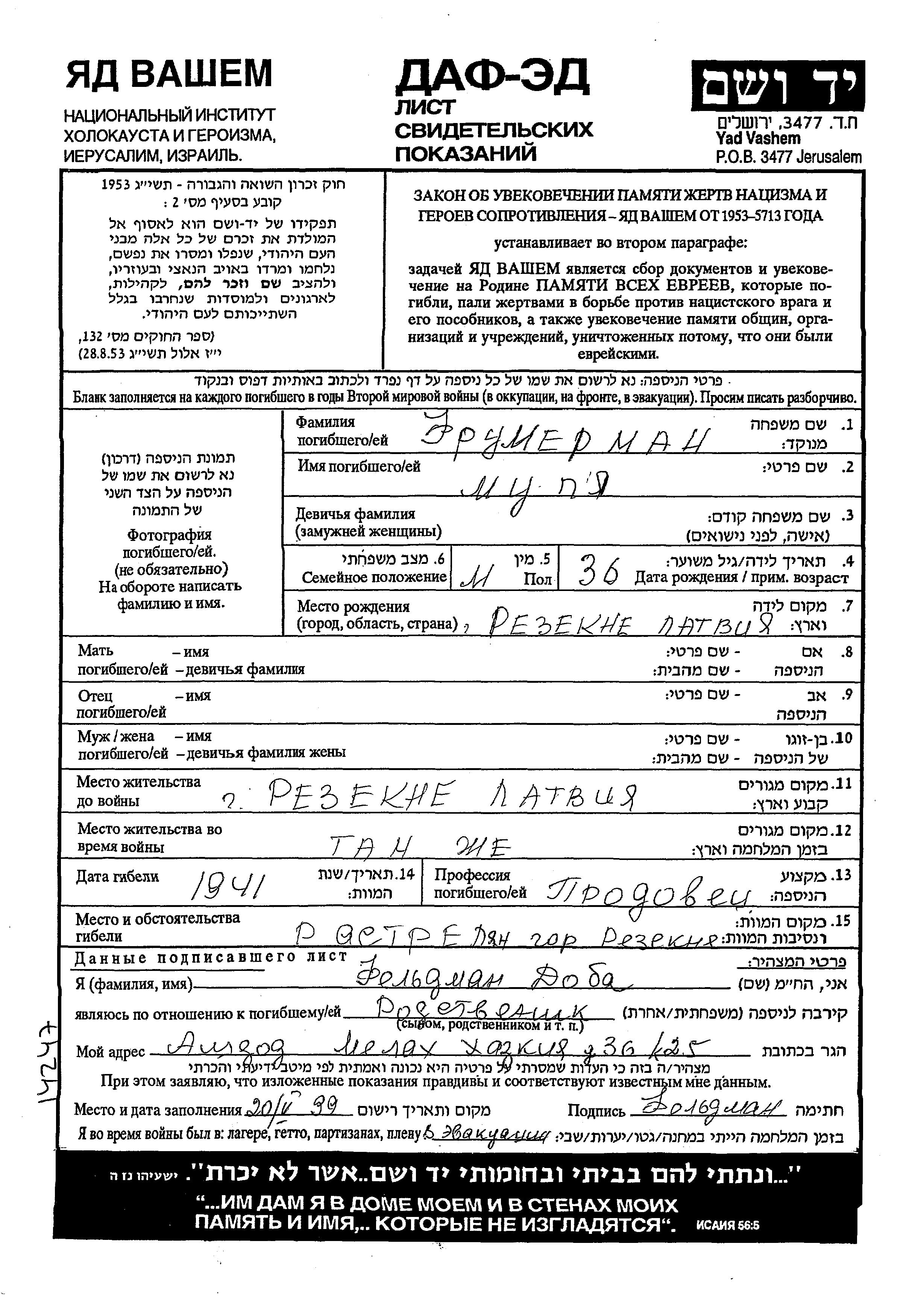 Frumerman Mulya Rēzekne, Lettonie Feuille de témoignage