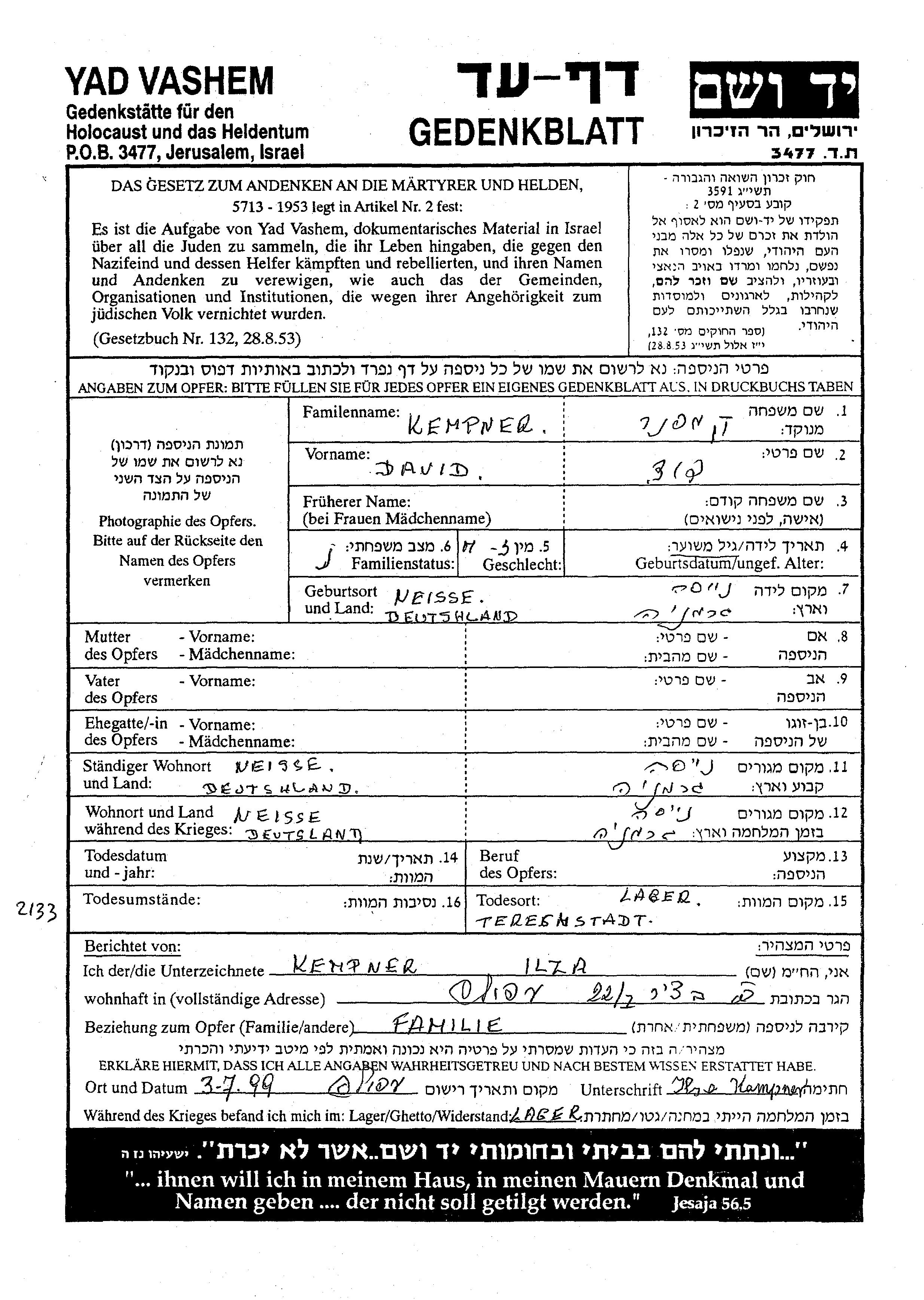 David a été assassiné pendant la Shoah. Lieu de la mort: Theresienstadt, Tchécoslovaquie.