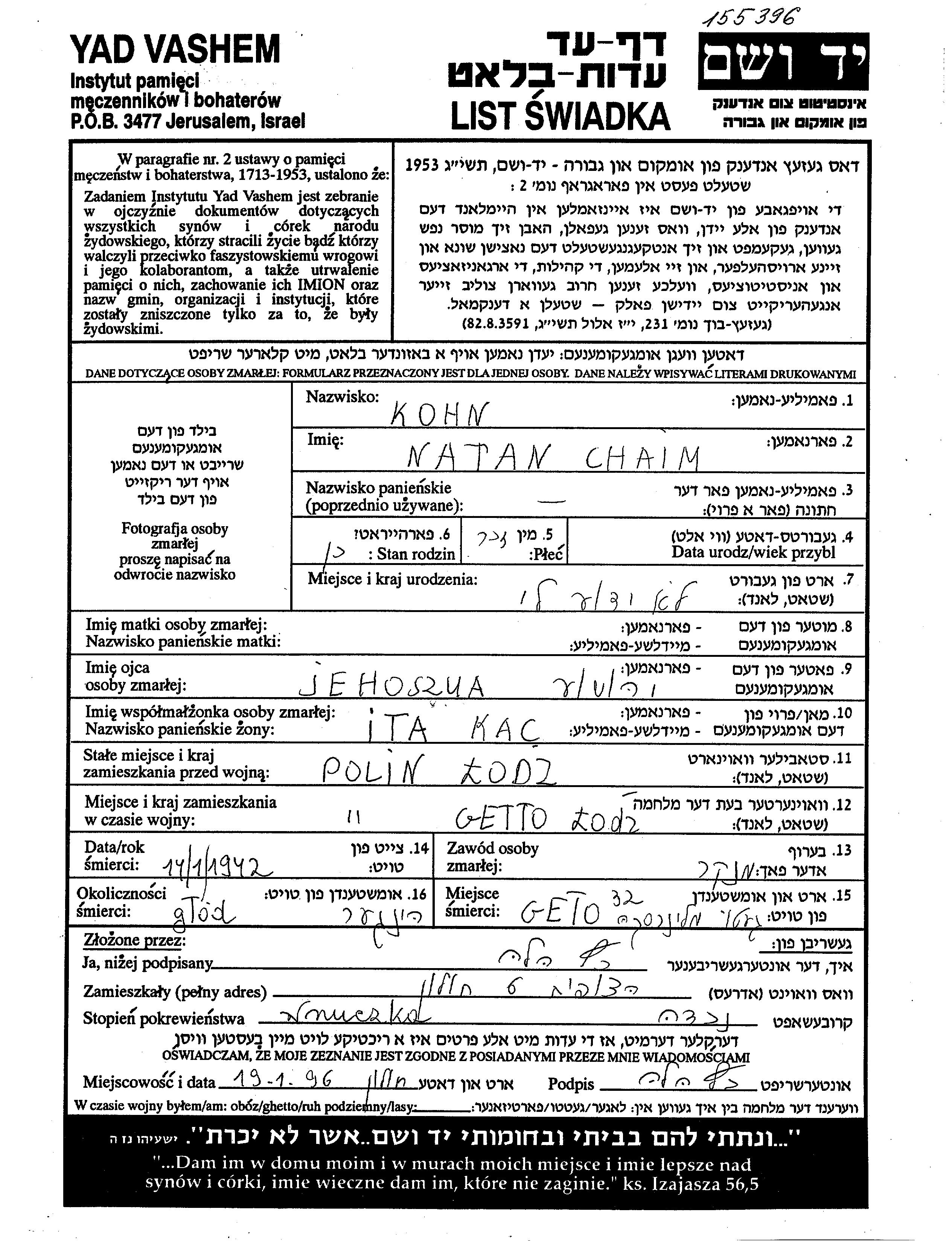 Kohn Kun Chaim Natan Lodz, Pologne Feuille de témoignage