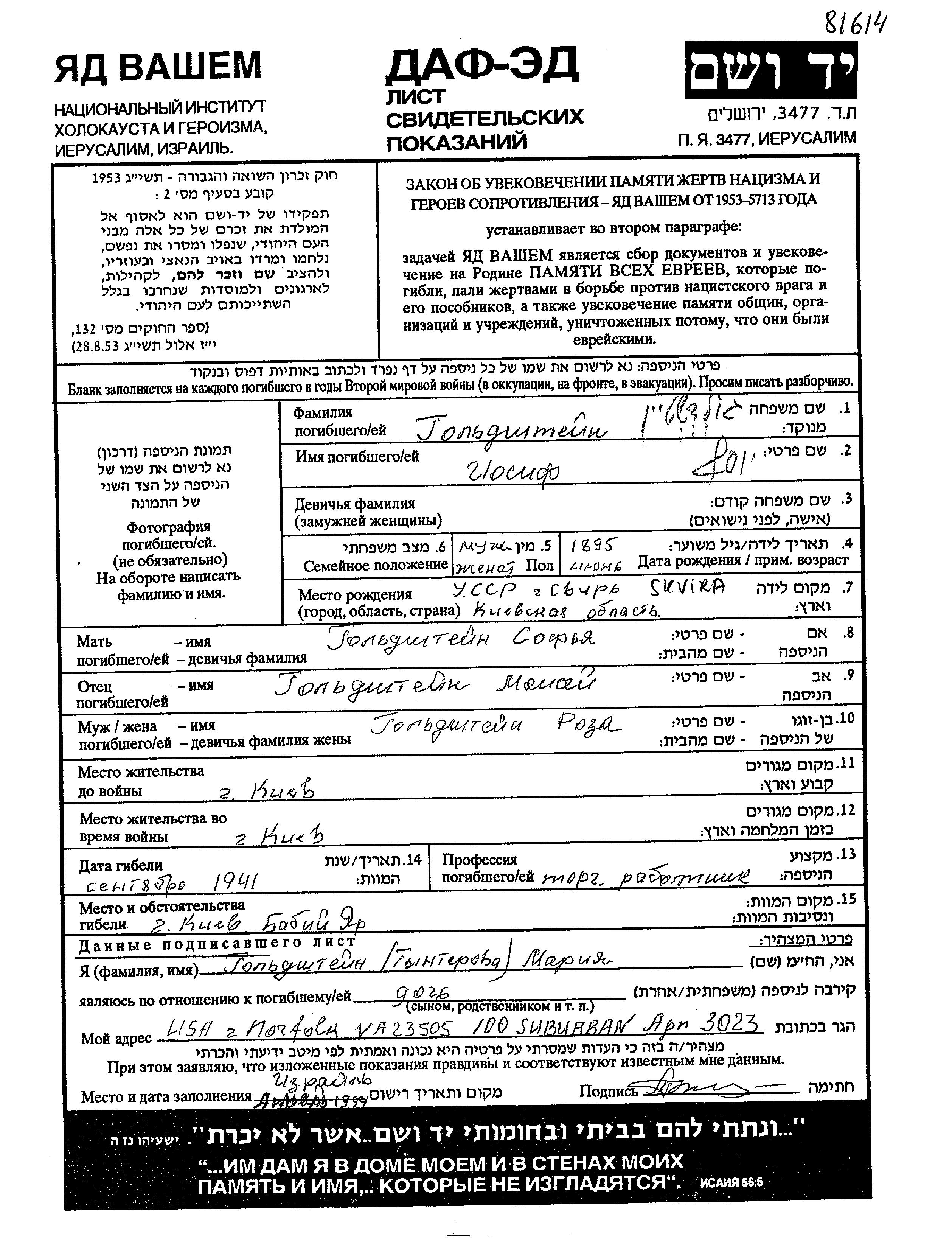 Goldshtein Iosif 1895 Kiyev, Ukraine (URSS) Feuille de témoignage