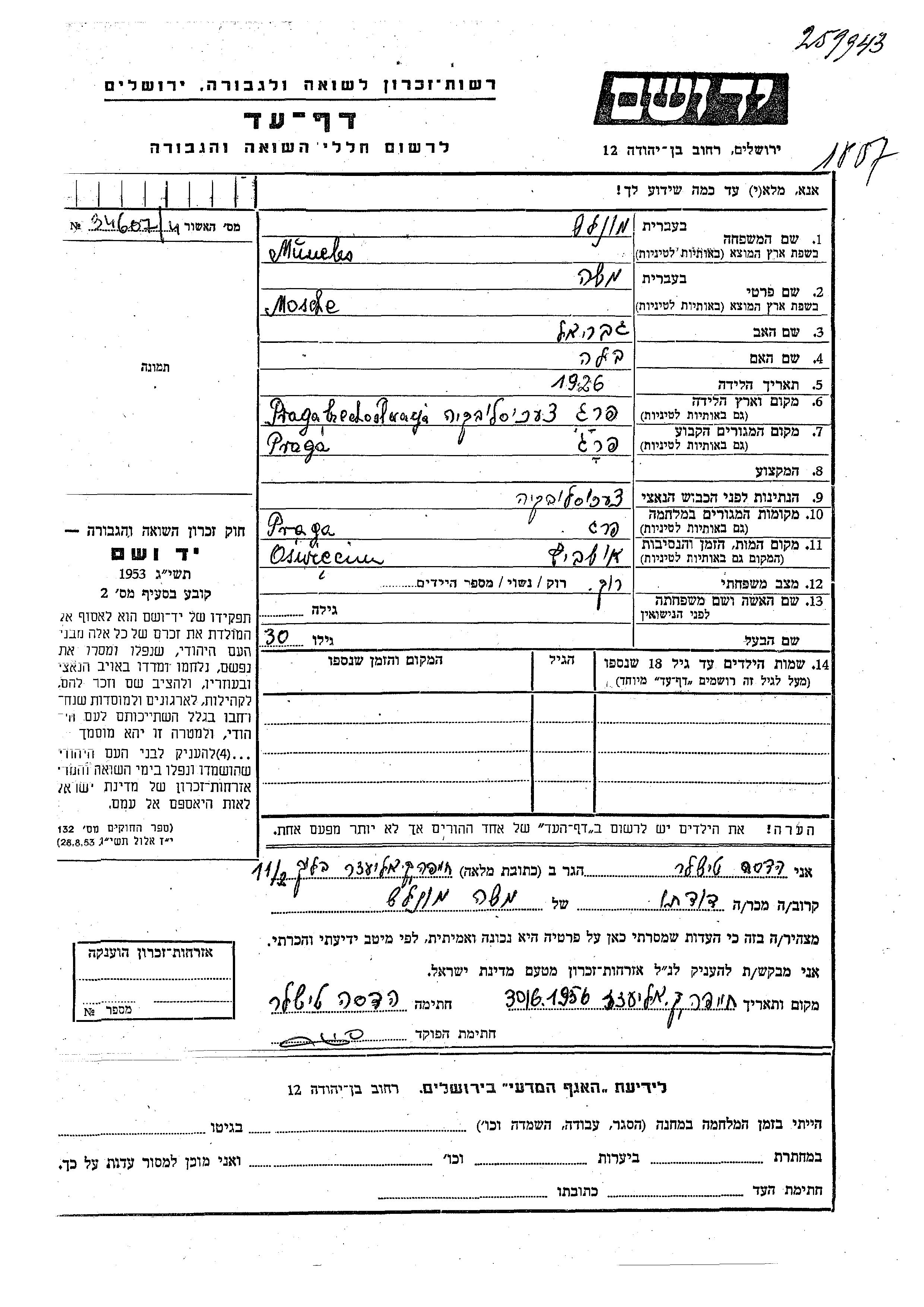 Mosche Muneles est né à Prague, Tchécoslovaquie en 1926, fils de Gabriel et de Bela. Il était Célibataire. Avant la seconde guerre mondiale il vivait à Prag, Tchécoslovaquie. Au cours de la guerre, il était à Prague, Tchécoslovaquie.
