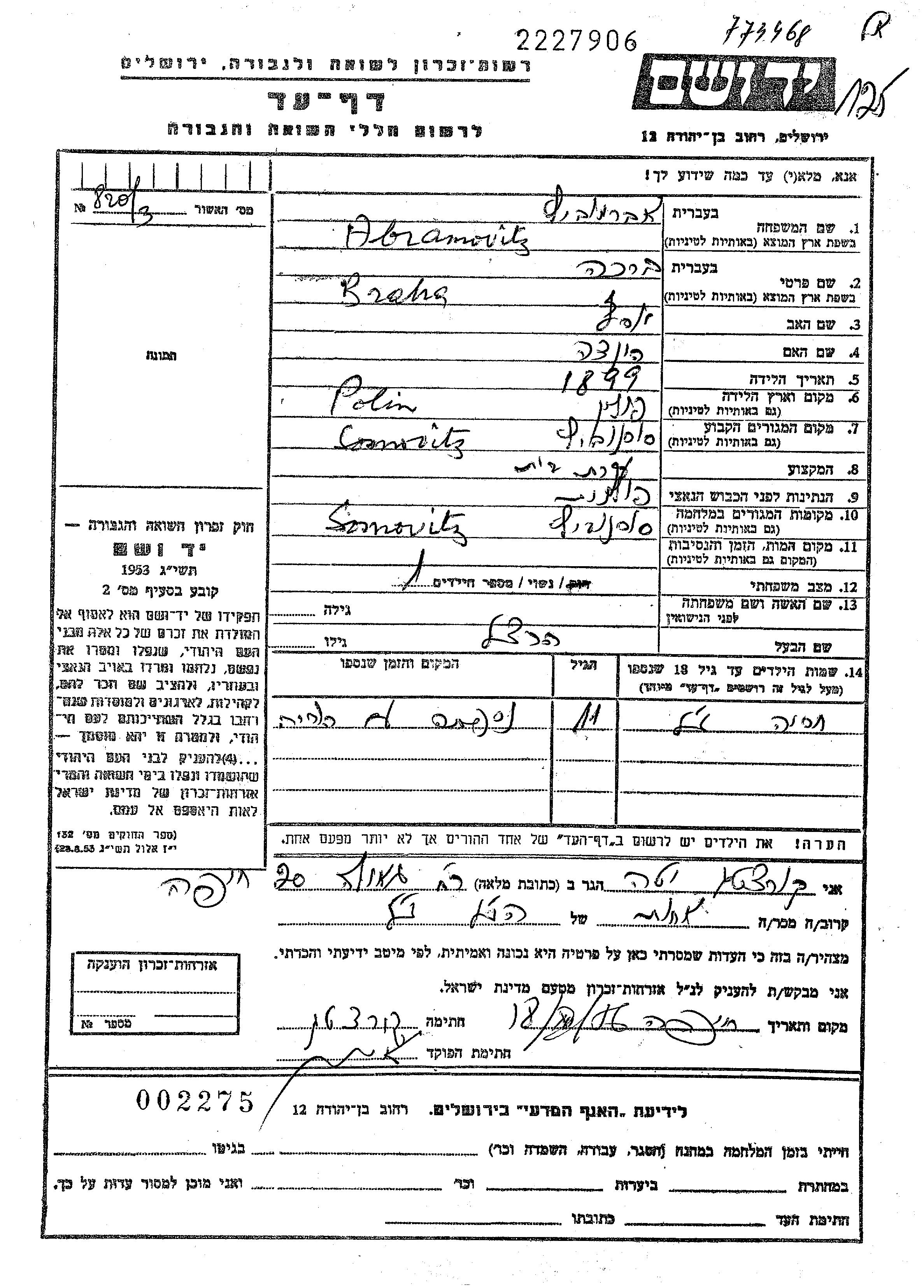 Abramovits Braha 1899 Sosnowiec, Pologne Feuille de témoignage