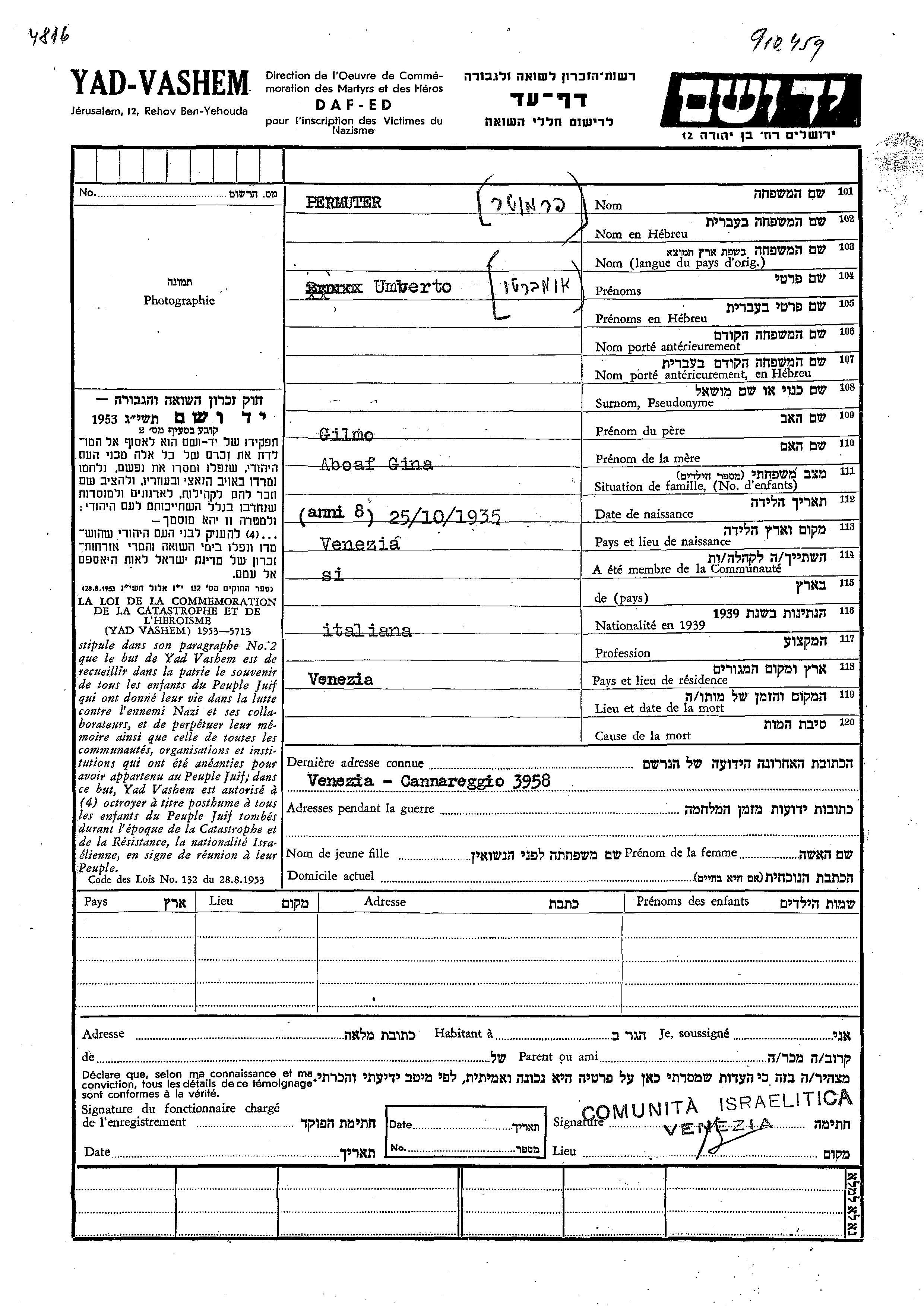 Umberto Permuter est né à Venezia, Italie en 1935, fils de Gilmo et de Gina. Avant la seconde guerre mondiale il vivait à Venezia, Italie.