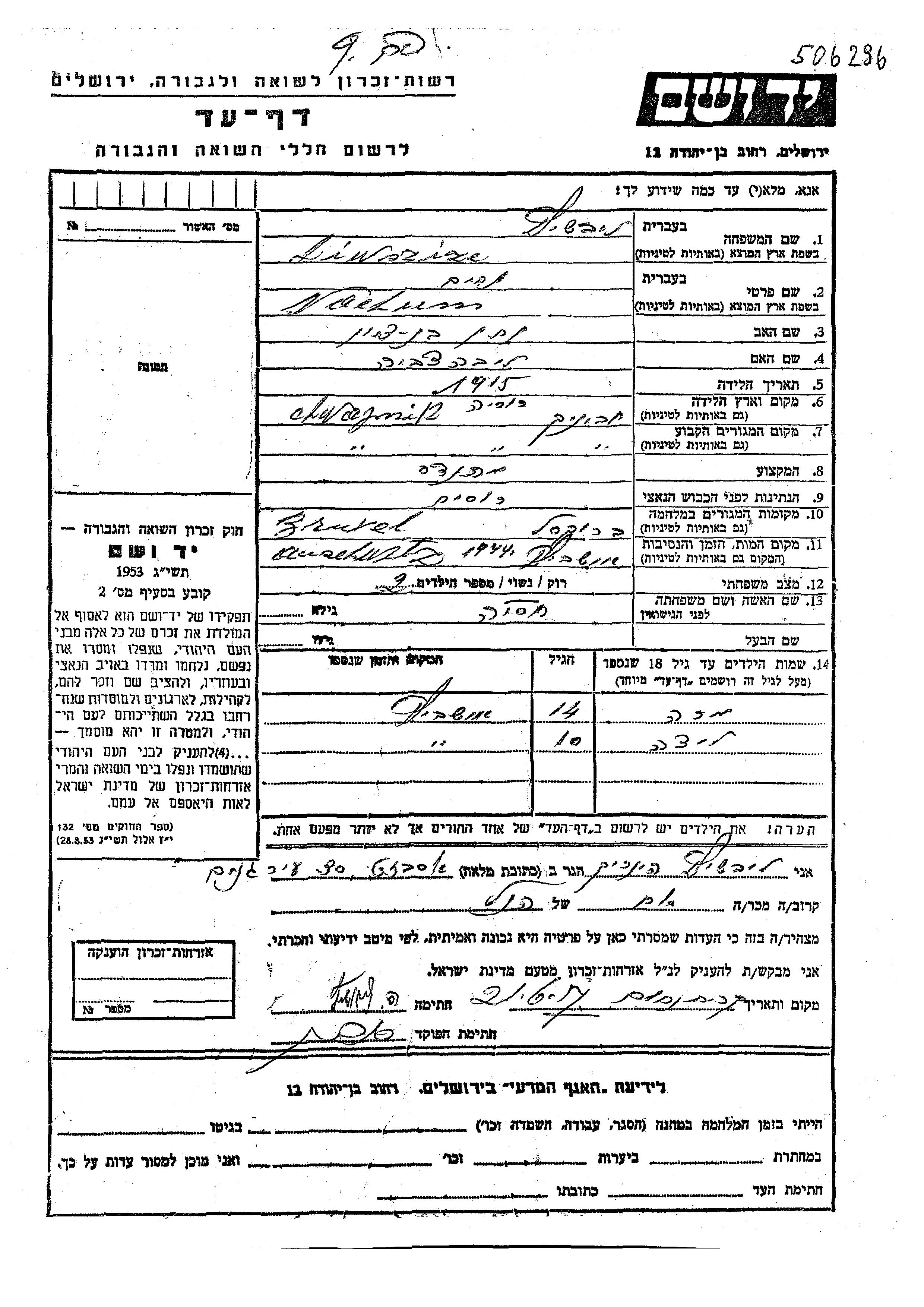 Nachum Liwszizc est né à Chwojnik, Pologne en 1915, fils de Natan Bentzion et de Liba Tzvia. Il était Ingénieur et Mariée à Khasia. Avant la seconde guerre mondiale il vivait à Chwojnik, Pologne. Au cours de la guerre, il était à Bruxelles, Belgique.