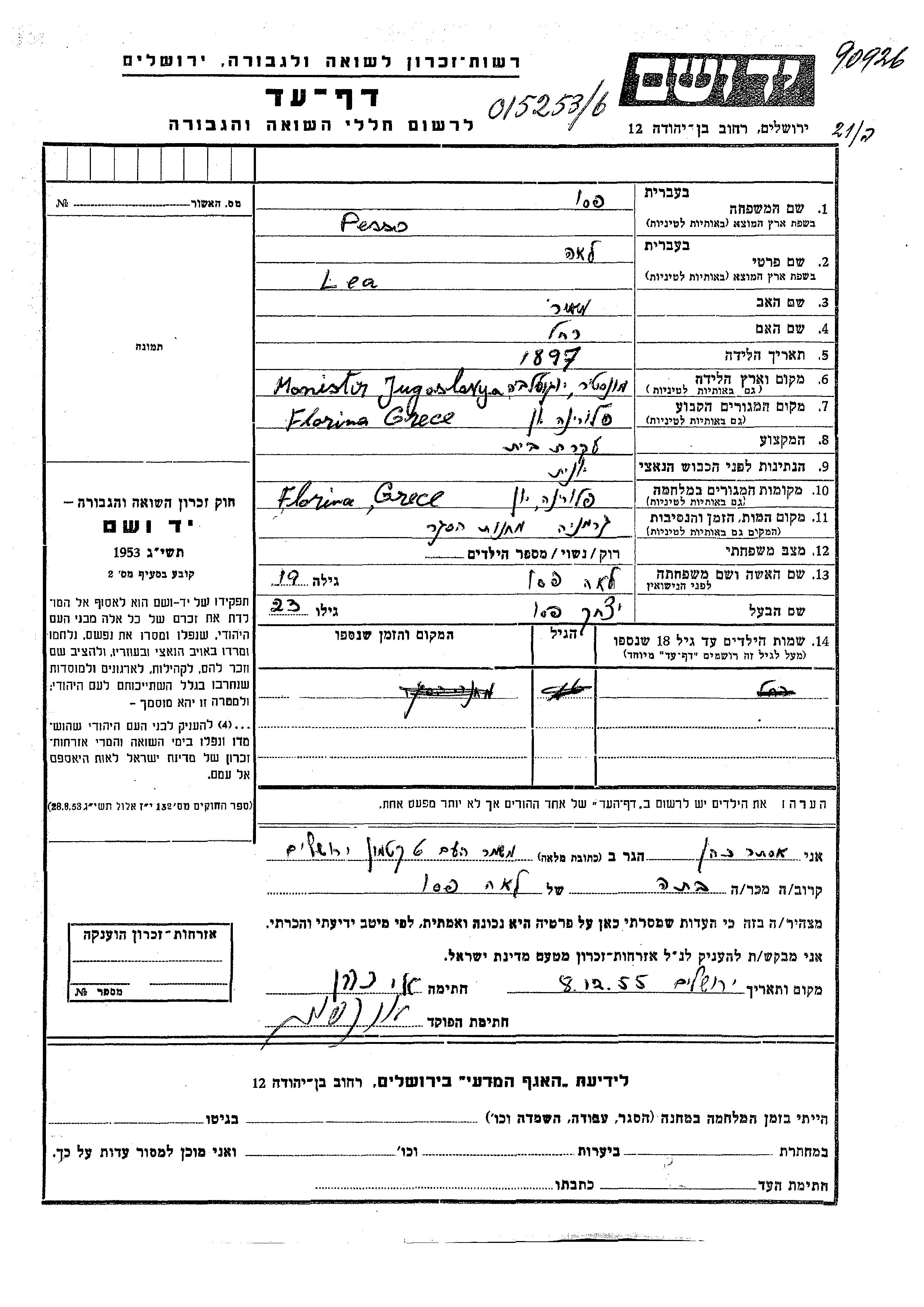 Pesso Pasi | Lea | 1897 | Florina, Grèce | Feuille de témoignage |