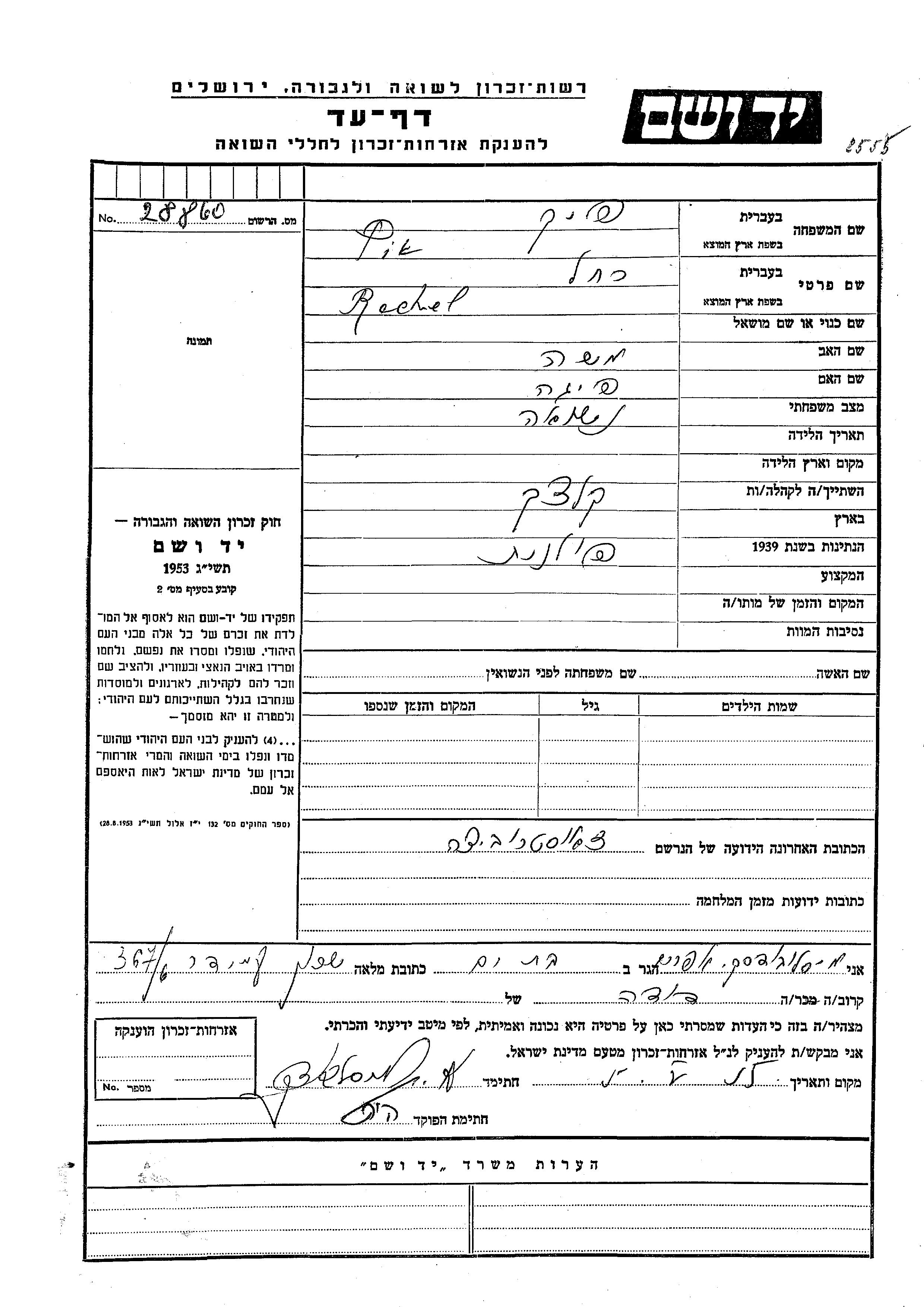 Rachel Pik est née fille de Moshe et de Feiga. Elle était Mariée. Avant la seconde guerre mondiale elle vivait à Kleck, Pologne. Pendant la guerre, elle était à Zaostrowiecze, Pologne.