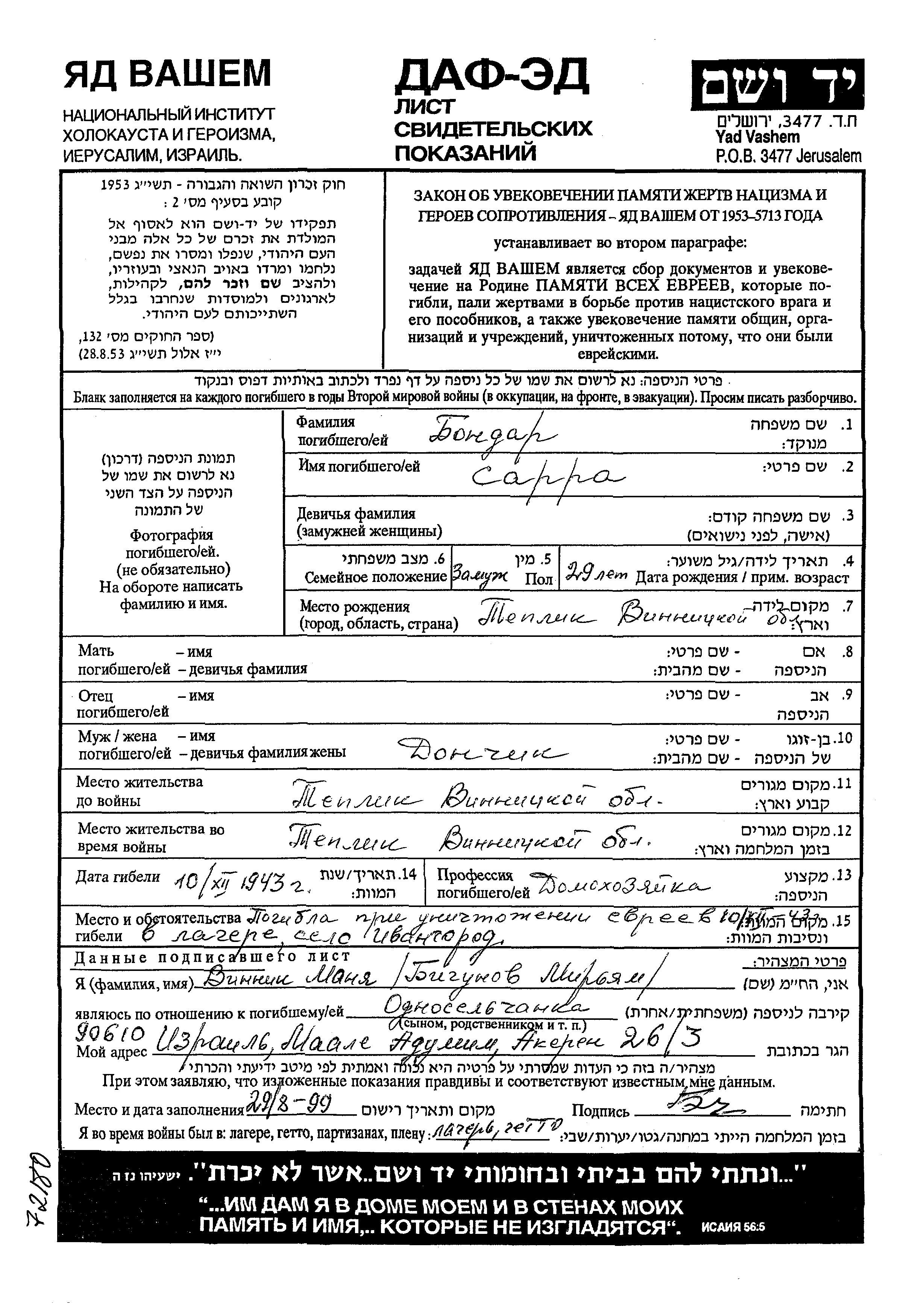 Bondar Sarra Teplik, Ukraine (URSS) Feuille de témoignage