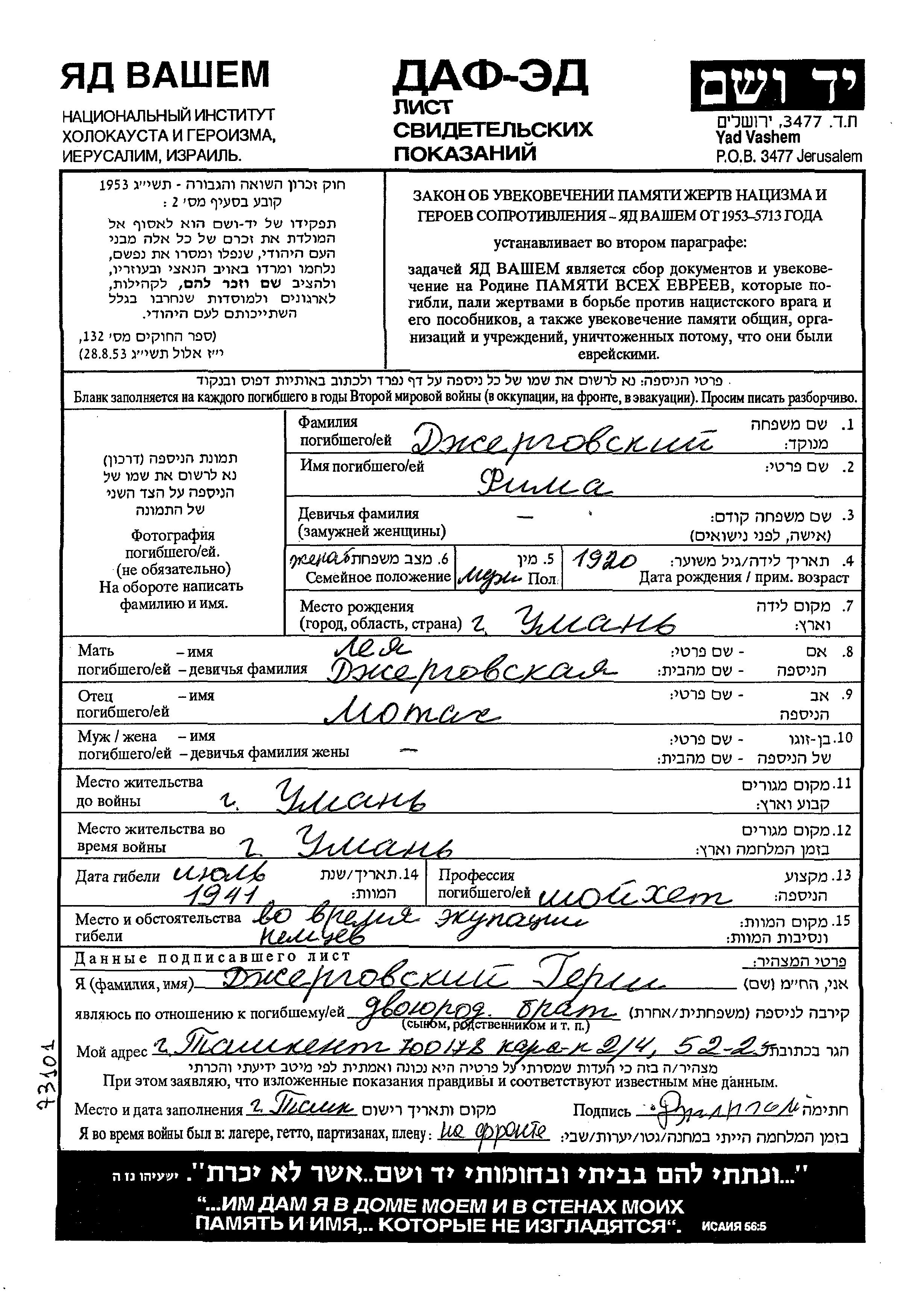 Yad Vashem - Pages of Testimony Names Memorial Collection