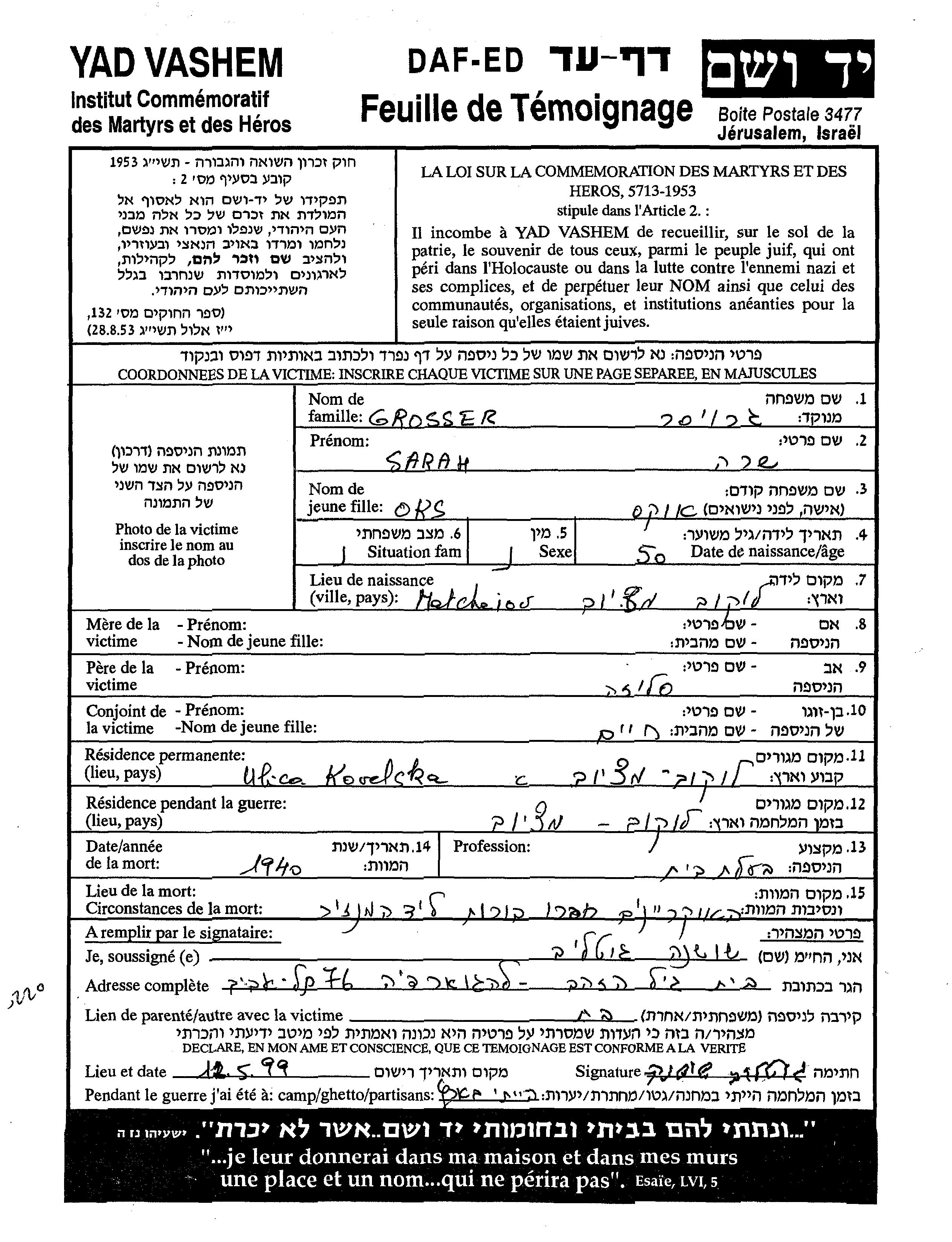 Grosser Sarah Maczejow, Pologne Feuille de témoignage