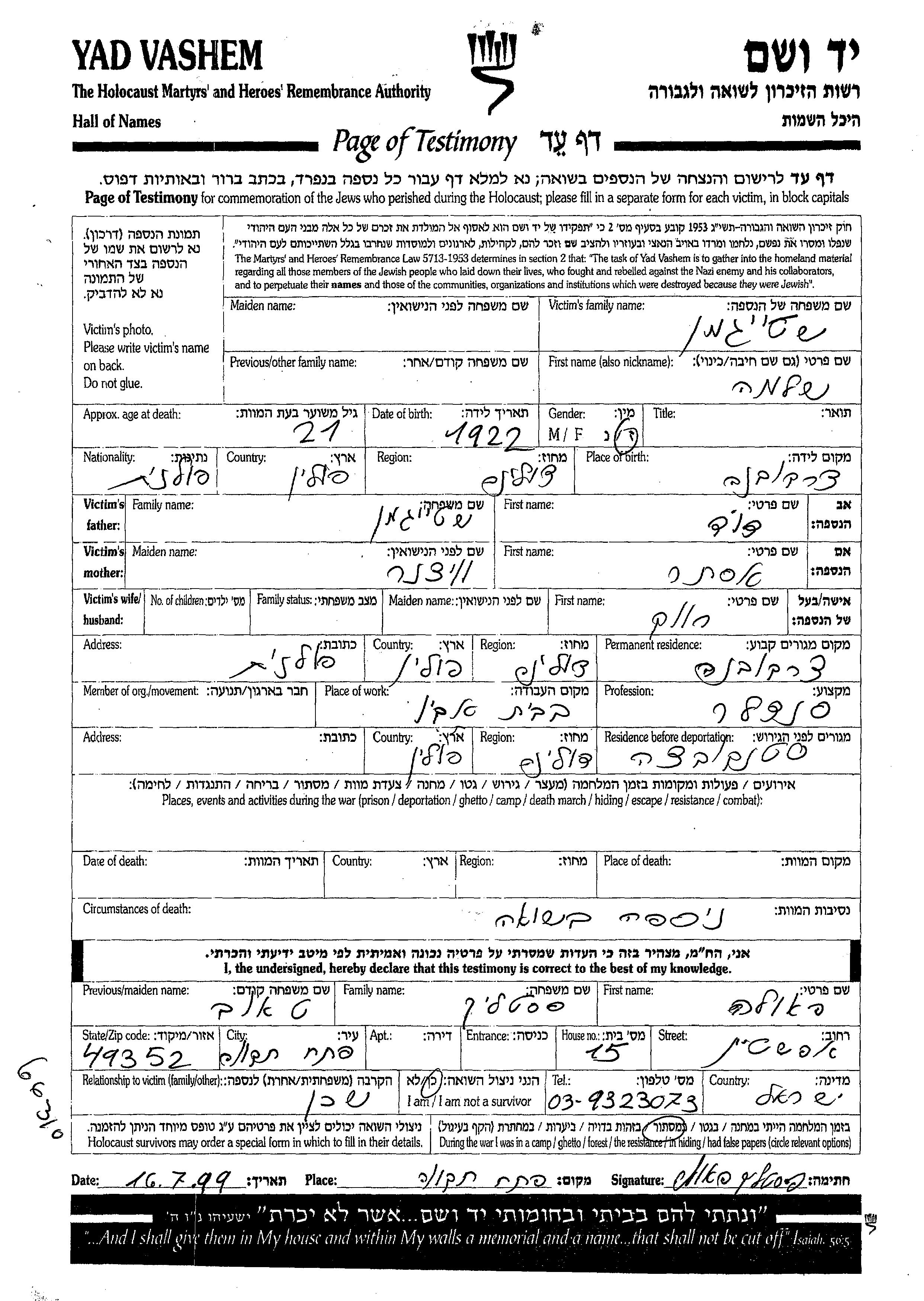 Yad Vashem - Pages of Testimony Names Memorial Collection
