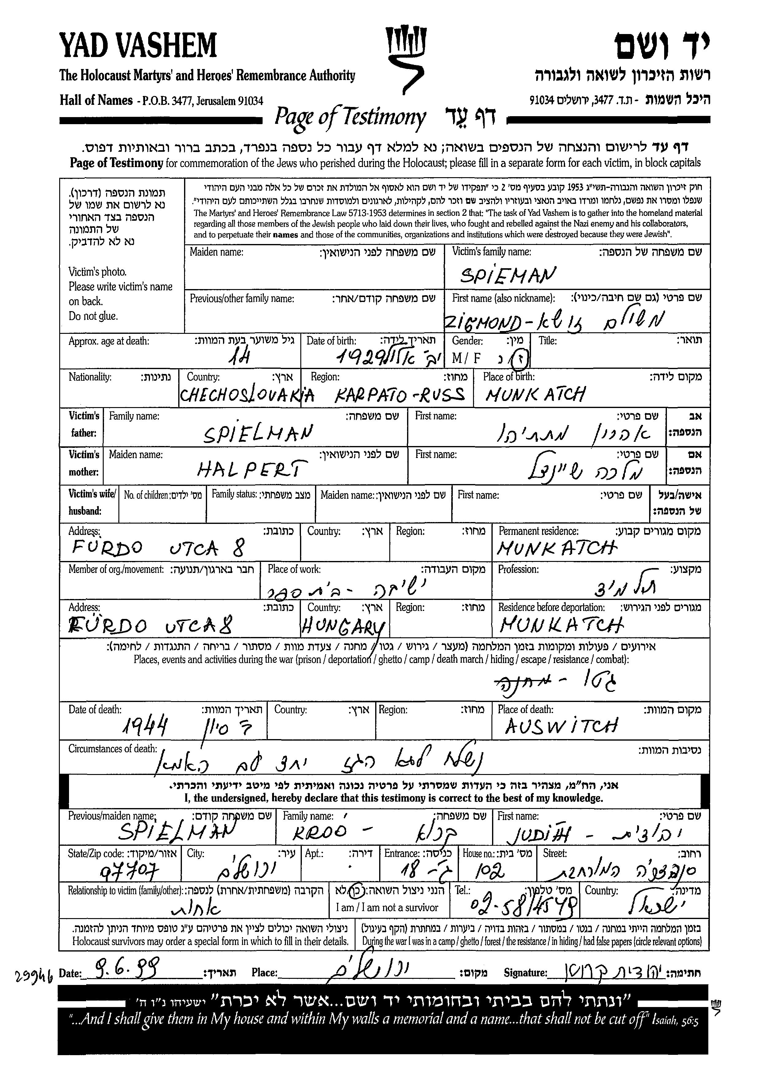 Zigmond Meshulam Zusman Spielman est né à Munkatsch, Tchécoslovaquie en 1929, fils de Aharon Matatiahu et de Malka Sheindl. Il était Élève et Enfant. Avant la seconde guerre mondiale il vivait à Munkatsch, Tchécoslovaquie. Au cours de la guerre, il était à Munkatsch, Tchécoslovaquie.