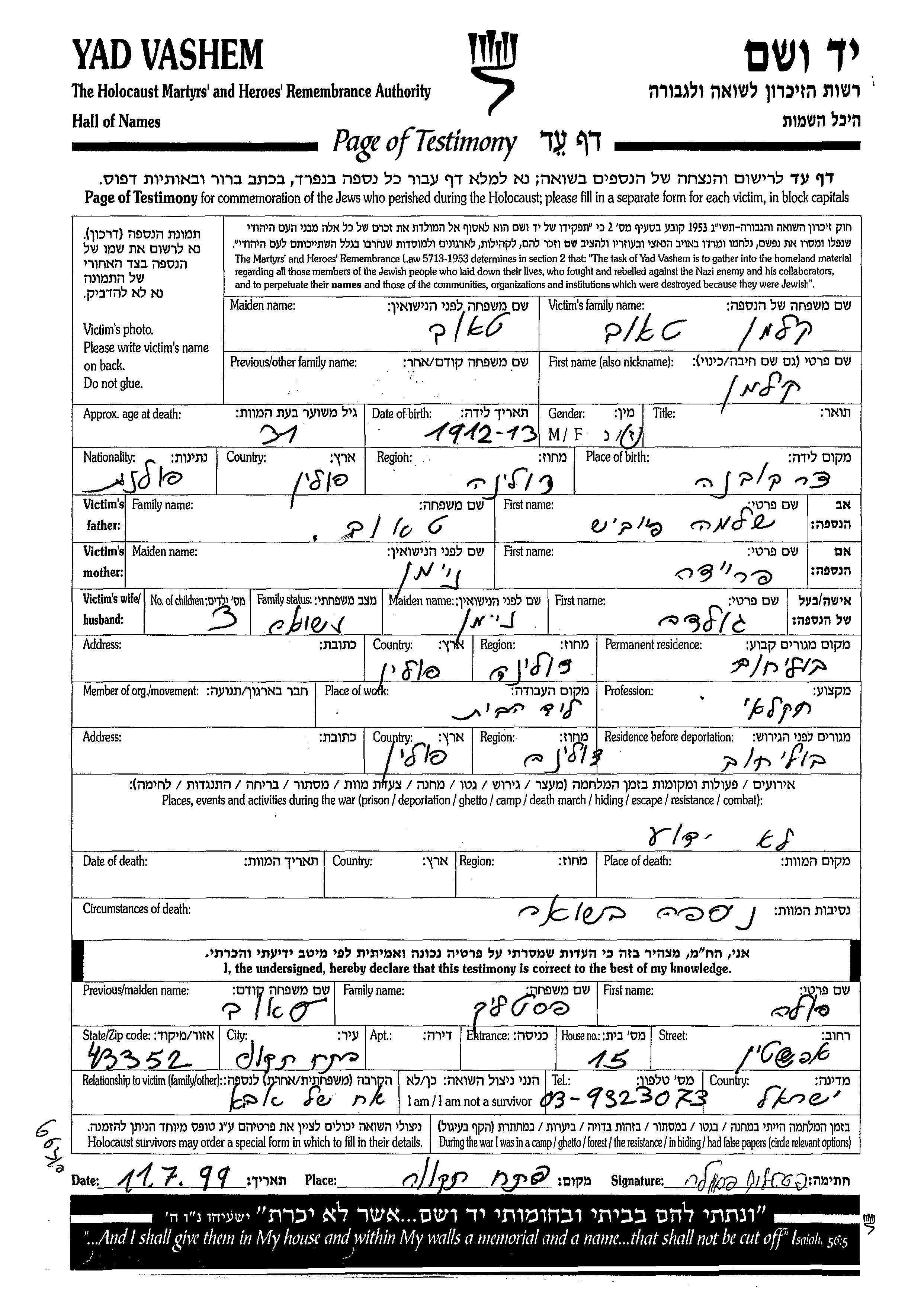 Yad Vashem - Pages of Testimony Names Memorial Collection