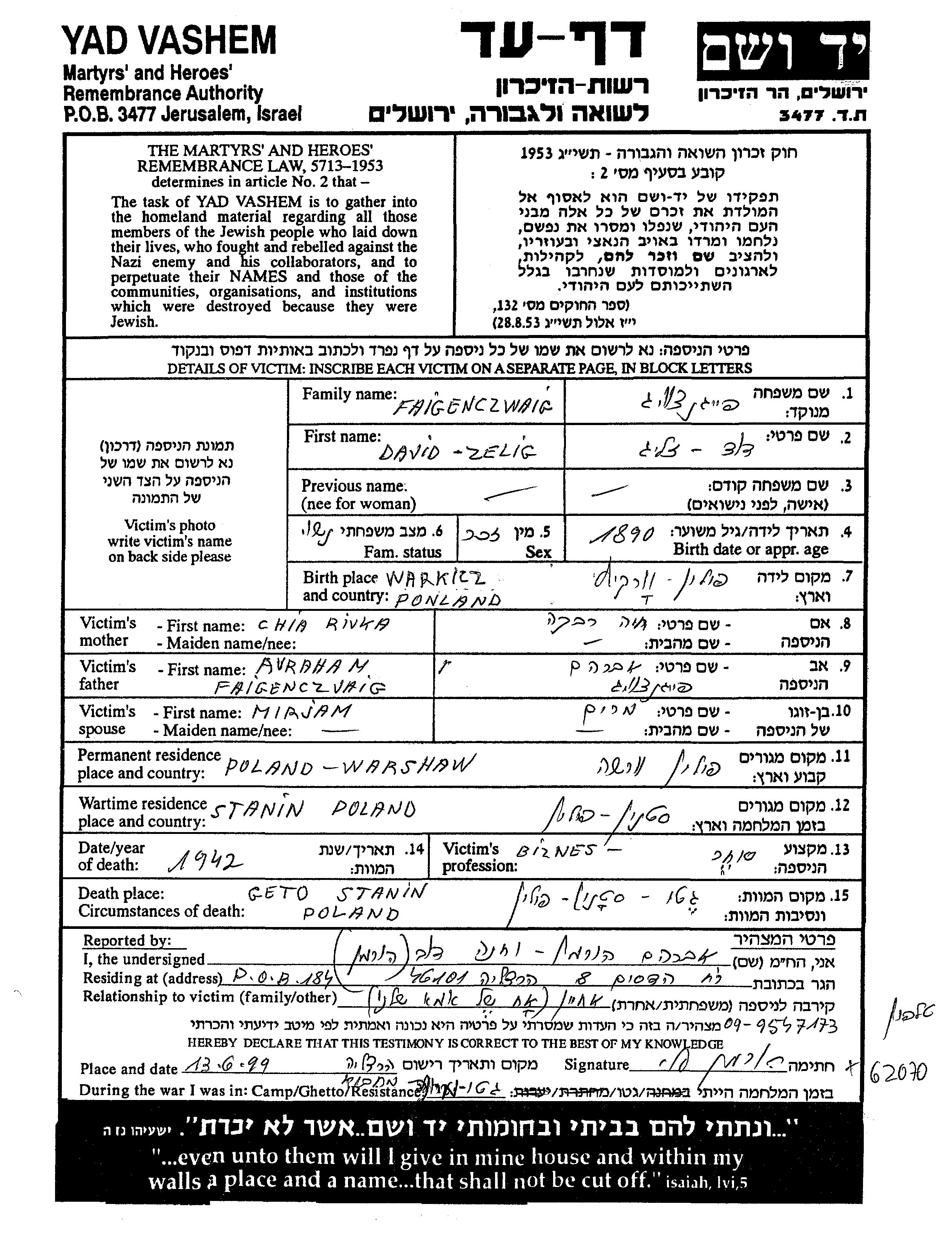 David Zelig Faigenczwaig est né à Warkocz, Pologne en 1890, fils de Avraham et de Chia Rivka. Il était Commerçant/e et Mariée à Mirjam. Avant la seconde guerre mondiale il vivait à Varsha, Pologne. Au cours de la guerre, il était à Stanin, Pologne.