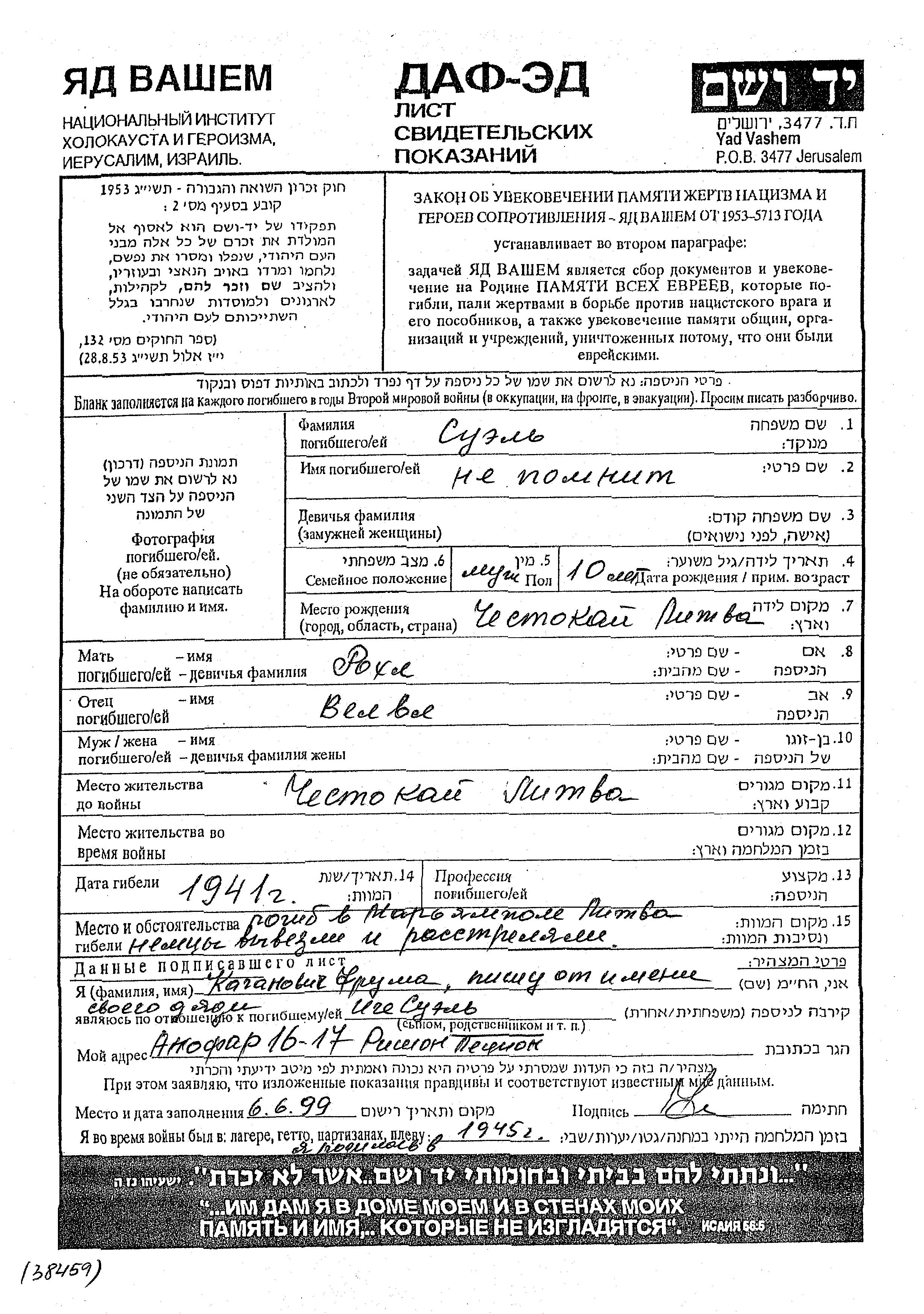 Suel prénom inconnu Chestokay, Lituanie Feuille de témoignage