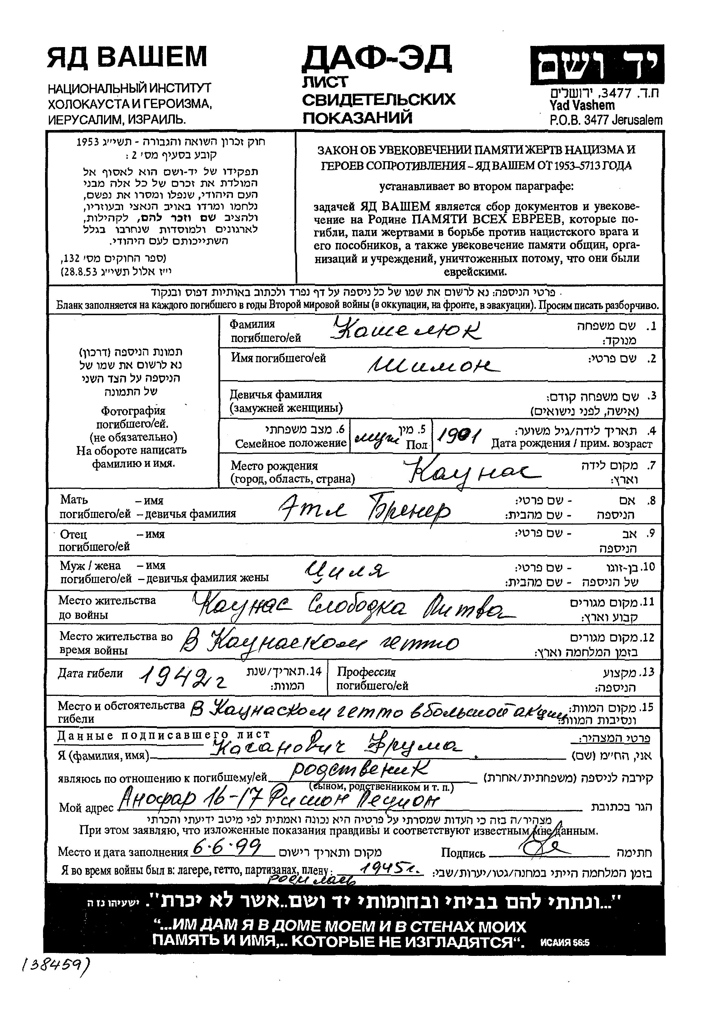 Kashelyuk Shimon 1901 Kaunas Slobodka, Lituanie Feuille de témoignage