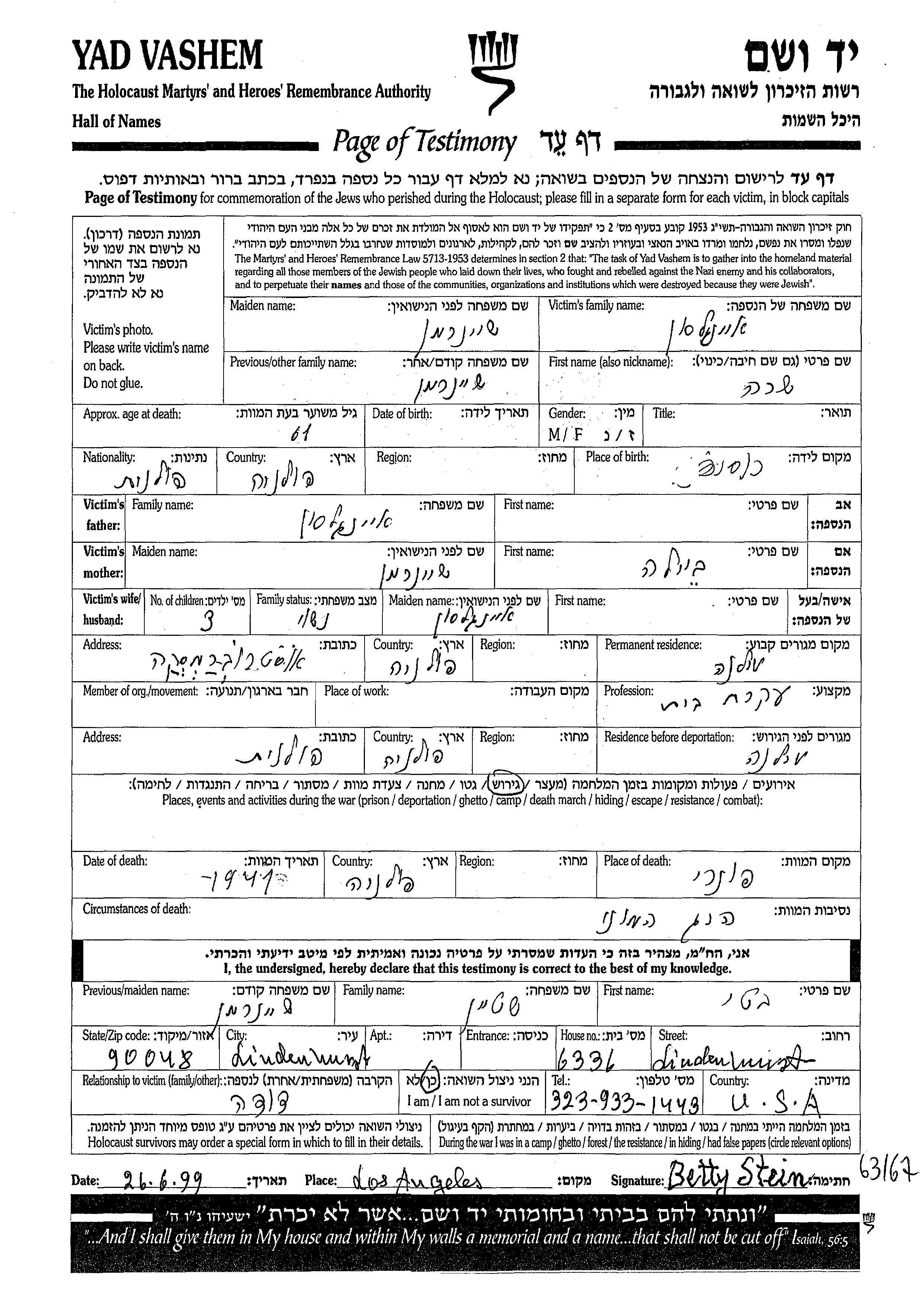 Yad Vashem - Pages of Testimony Names Memorial Collection
