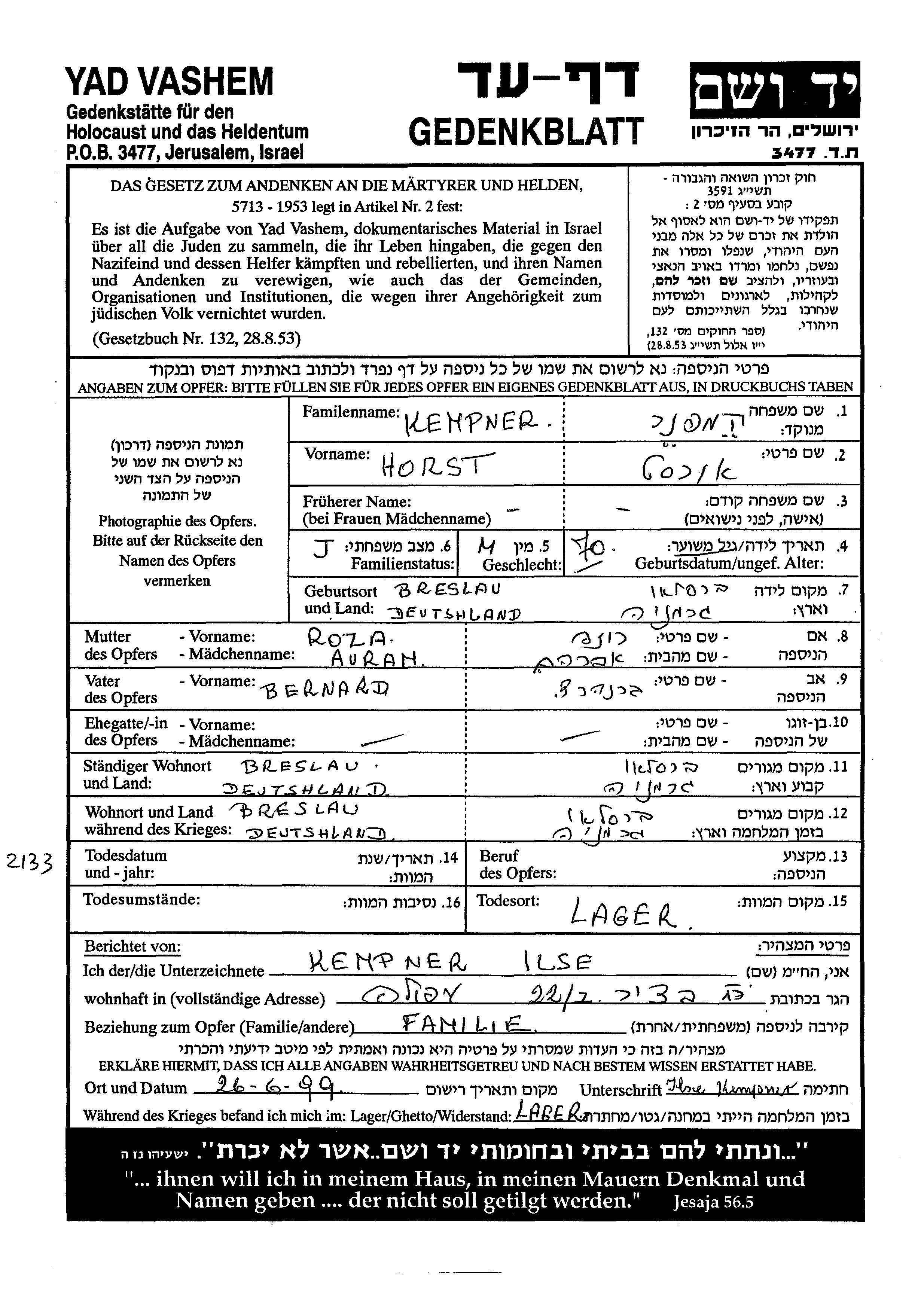 Orst Kempner est né à Breslau, Allemagne, fils de Bernard et de Roza née Avram. Avant la seconde guerre mondiale il vivait à Breslau, Allemagne. Au cours de la guerre, il était à Breslau, Allemagne.